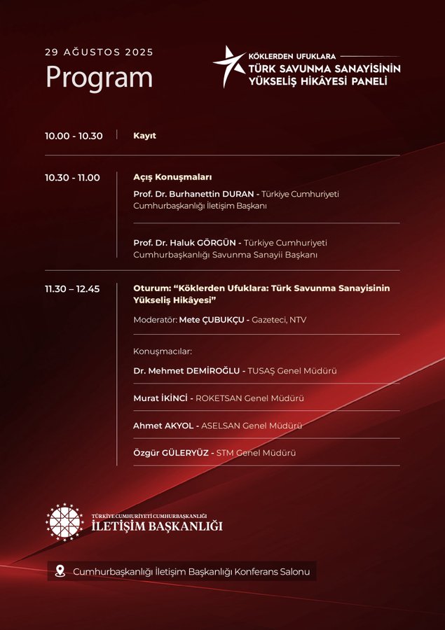 The Presidency’s Directorate of Communications will host a panel entitled “From Roots to Horizons: The Story of Türkiye’s Rising Defence Industry” tomorrow in Ankara.