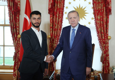 President Recep Tayyip Erdoğan received Palestinian director Basel Adra at the Dolmabahçe Presidential Office in Istanbul. Source: Presidency of the Republic of Türkiye
