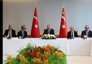 President Recep Tayyip Erdoğan, who is in New York for the 80th session of the United Nations General Assembly, met with Chair of the U.S.-Türkiye Business Council Hamdi Ulukaya, council members, and senior executives of US companies at the Turkish House. Minister of Energy and Natural Resources Alparslan Bayraktar, Minister of Treasury and Finance Mehmet Şimşek, Minister of Health Kemal Memişoğlu, Minister of Industry and Technology Mehmet Fatih Kacır and Minister of Trade Ömer Bolat were also present at the meeting. Source: Presidency of the Republic of Türkiye