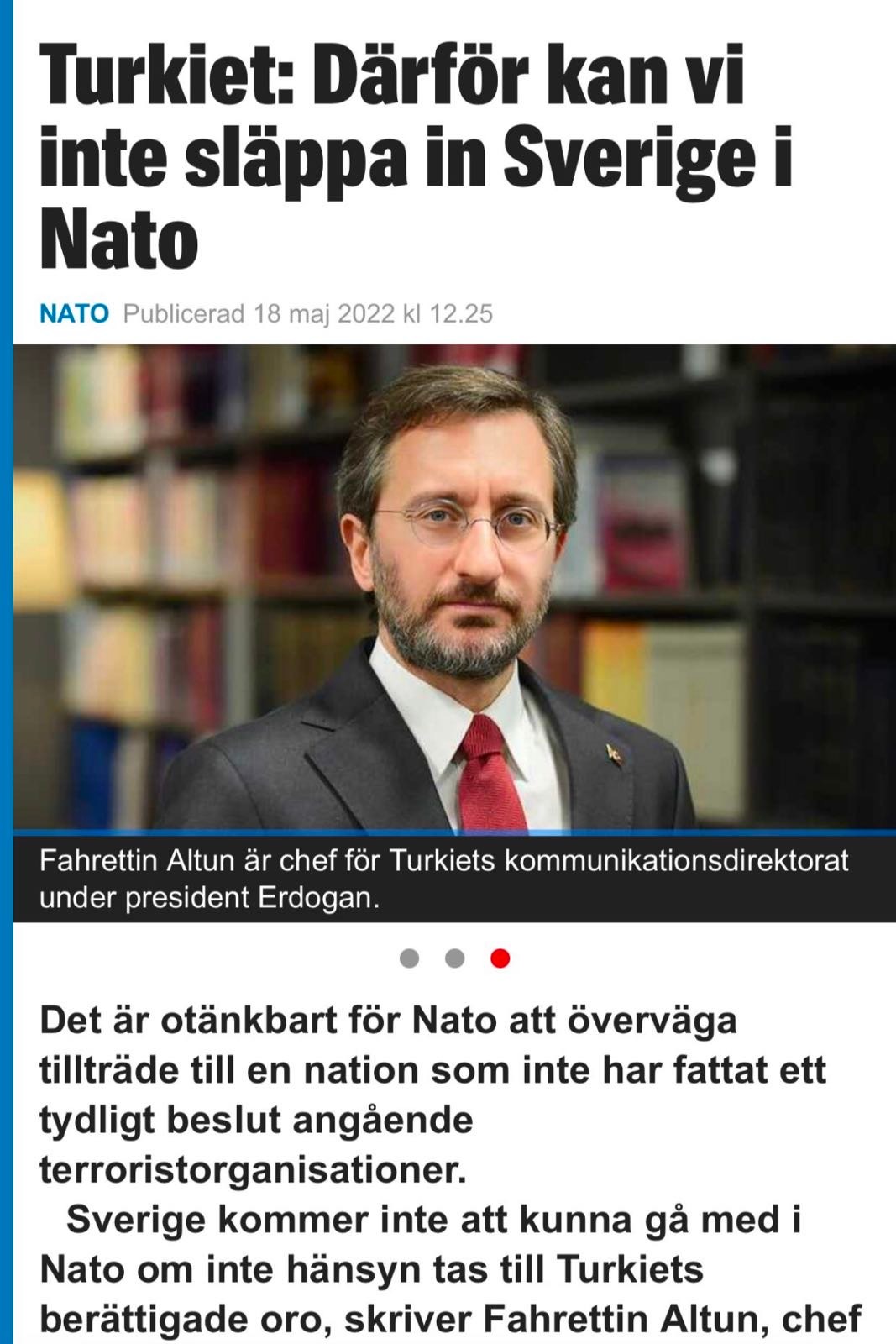 Presidency's Director of Communications Fahrettin Altun weighed in on Sweden's NATO membership in an article he penned for the Swedish newspaper Expressen: "Sweden will not be able to join NATO unless Türkiye's legitimate concerns are addressed. You must accept this fact if you expect the second-largest army in NATO to defend you in the event of an attack."