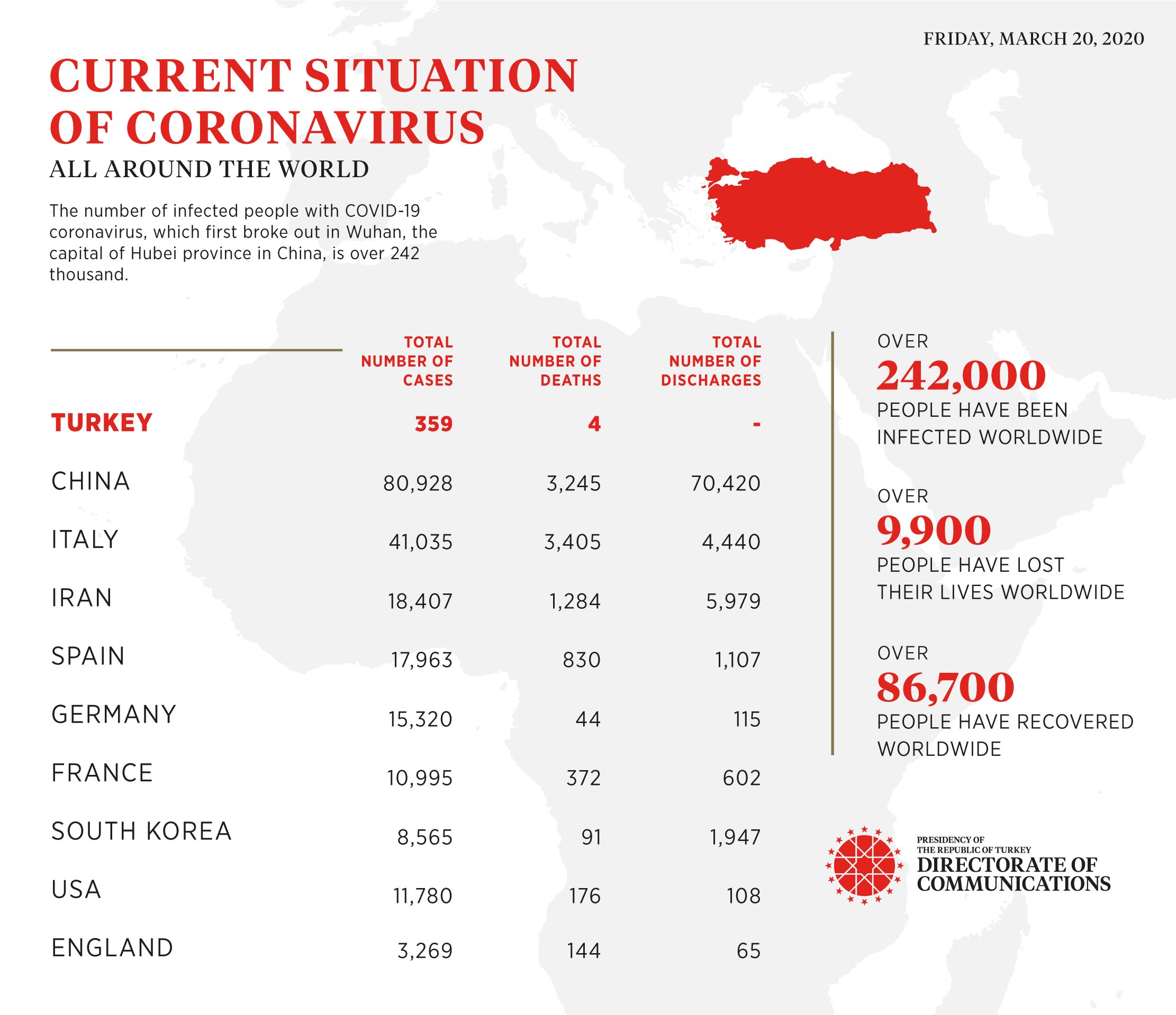 Directorate of Communications shared a post on its Twitter account, stating that the number of people infected with coronavirus (Covid-19), which broke out in Wuhan, the capital of Hubei province in China, exceeded 242 thousand, more than 9 thousand 900 people lost their lives and more than 86 thousand 700 people recovered throughout the world.