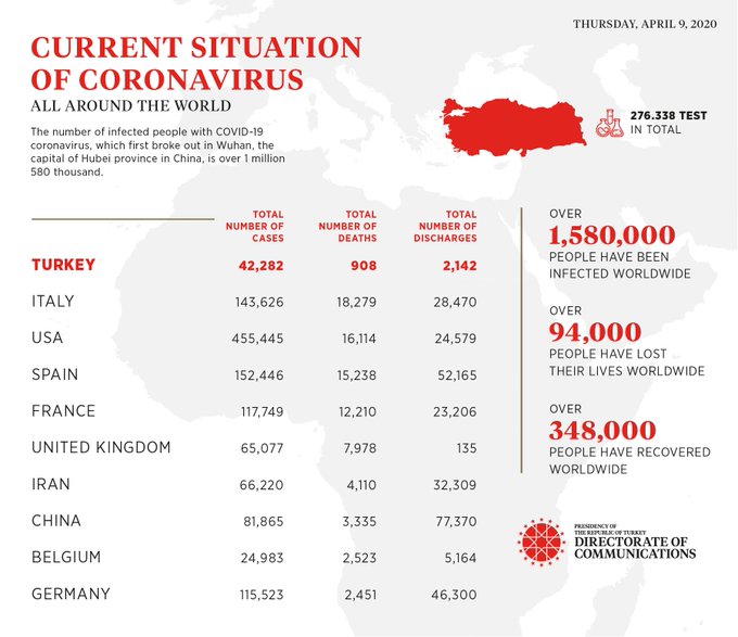 Directorate of Communications shared a post on its Twitter account, stating that the number of people infected with Covid-19, which broke out in Wuhan, the capital of Hubei province in China, exceeded 1 million 580 thousand, more than 94 thousand people lost their lives and more than 348 thousand people recovered throughout the world.