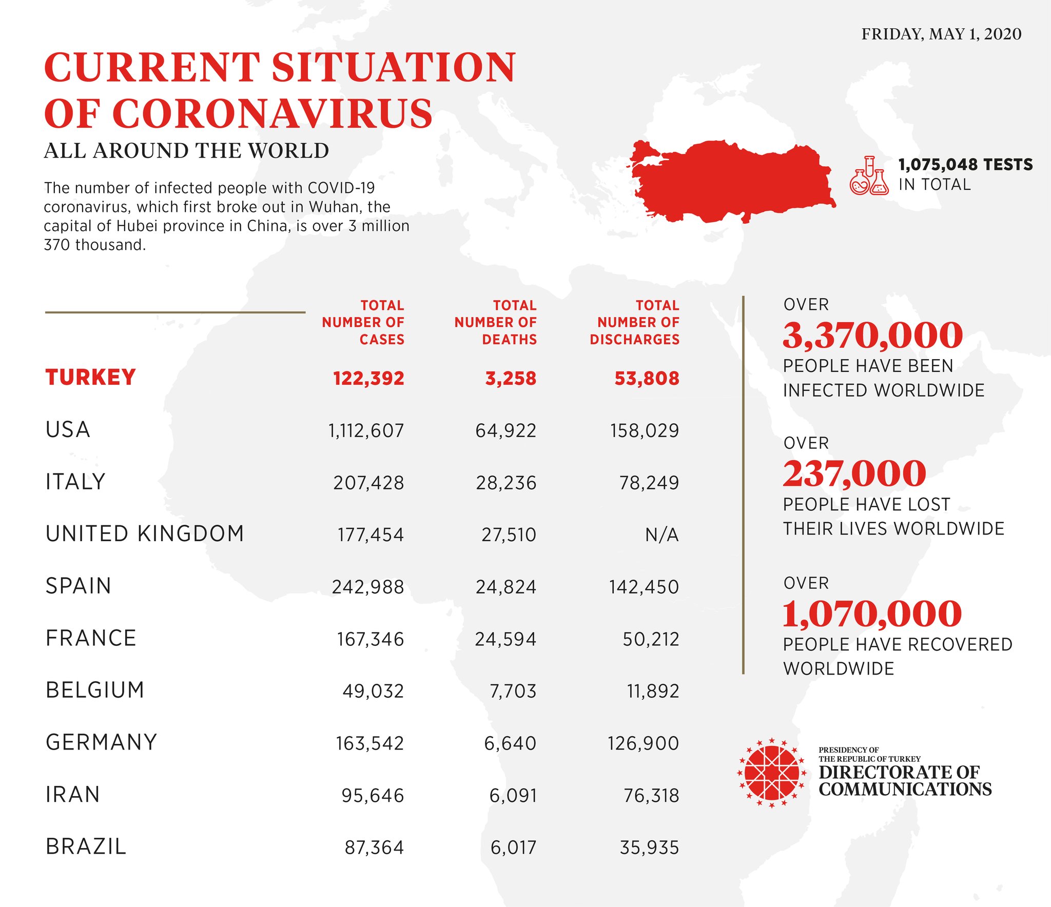 Directorate of Communications announced the number of cases, deaths, and discharges in countries affected by coronavirus (Covid-19) throughout the world as of May 1, 2020, 22:00.