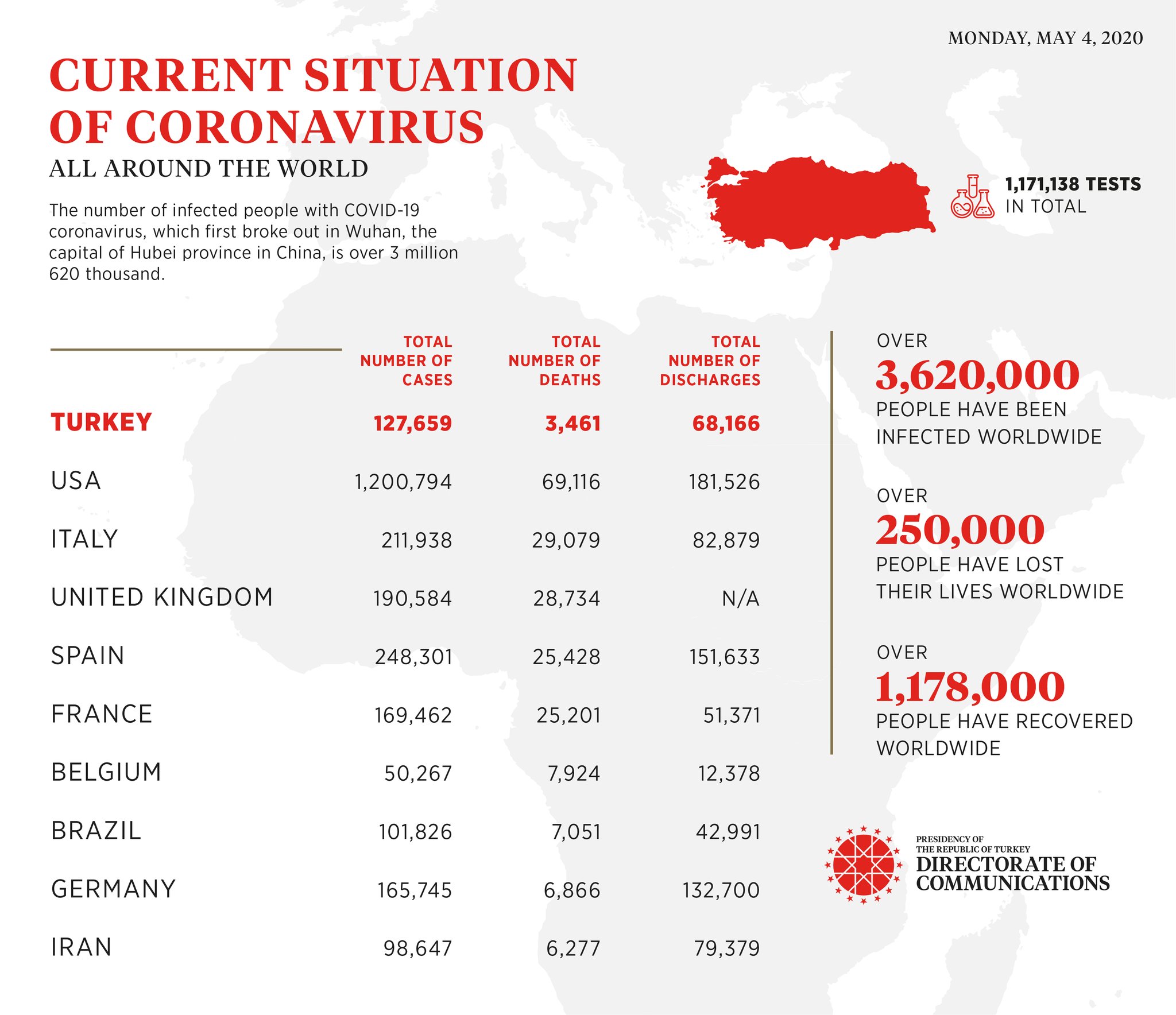 Directorate of Communications announced the number of cases, deaths, and discharges in countries affected by coronavirus (Covid-19) throughout the world as of May 4, 2020, 21:30.