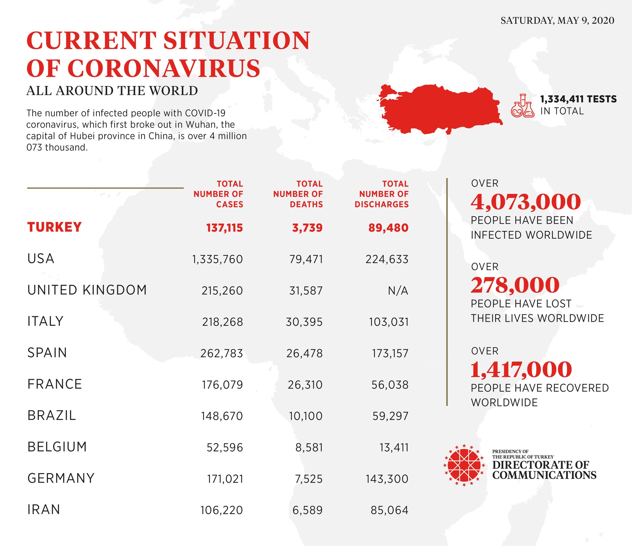 Directorate of Communications announced the number of cases, deaths, and discharges in countries affected by coronavirus (Covid-19) throughout the world as of May 9, 2020, 22:30.