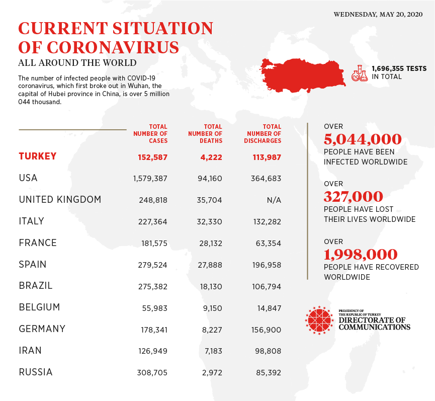 Directorate of Communications announced the number of cases, deaths, and discharges in countries affected by coronavirus (Covid-19) throughout the world as of May 20, 2020, 22:00.
