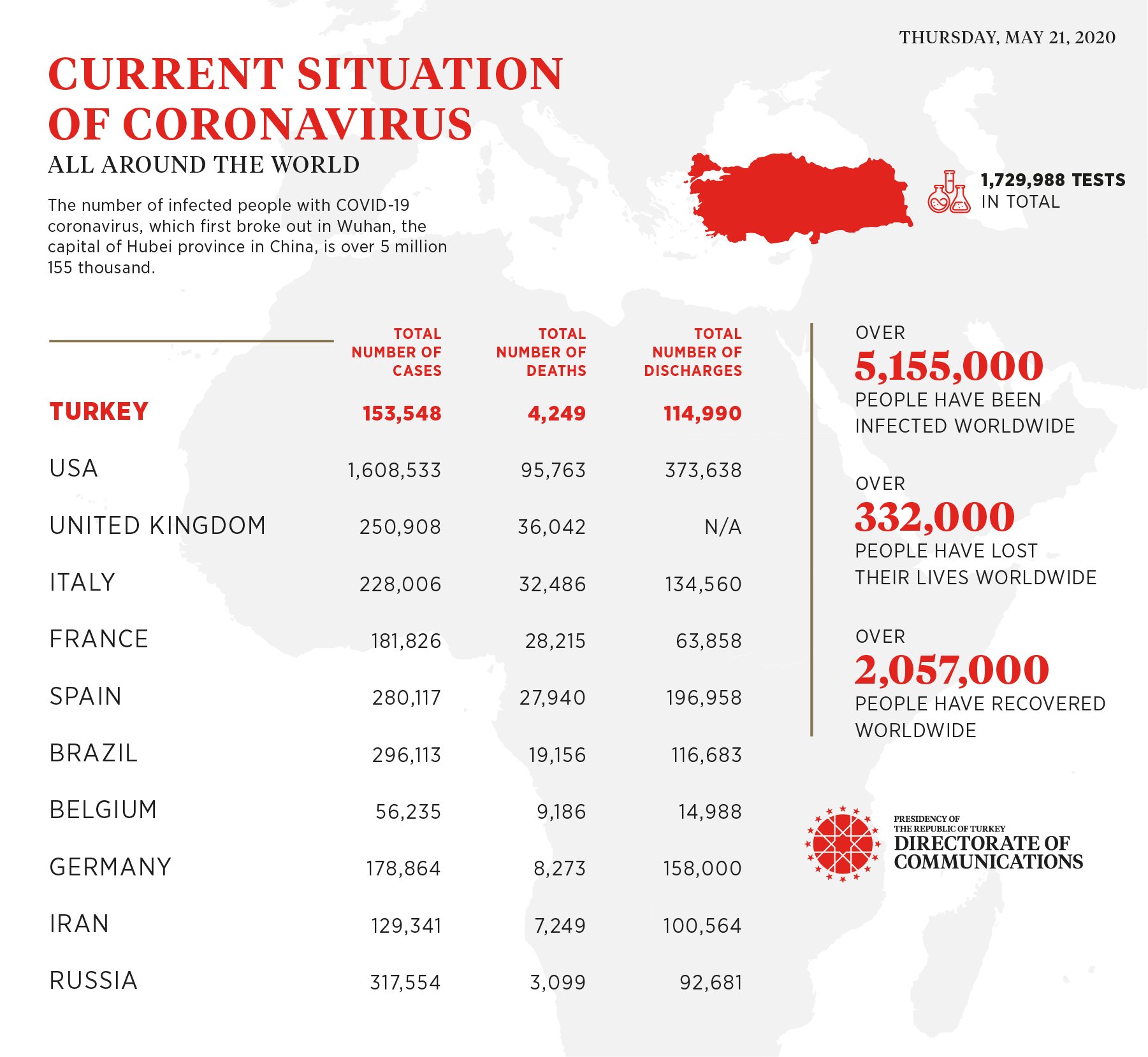 Directorate of Communications announced the number of cases, deaths, and discharges in countries affected by coronavirus (Covid-19) throughout the world as of May 21, 2020, 22:45.