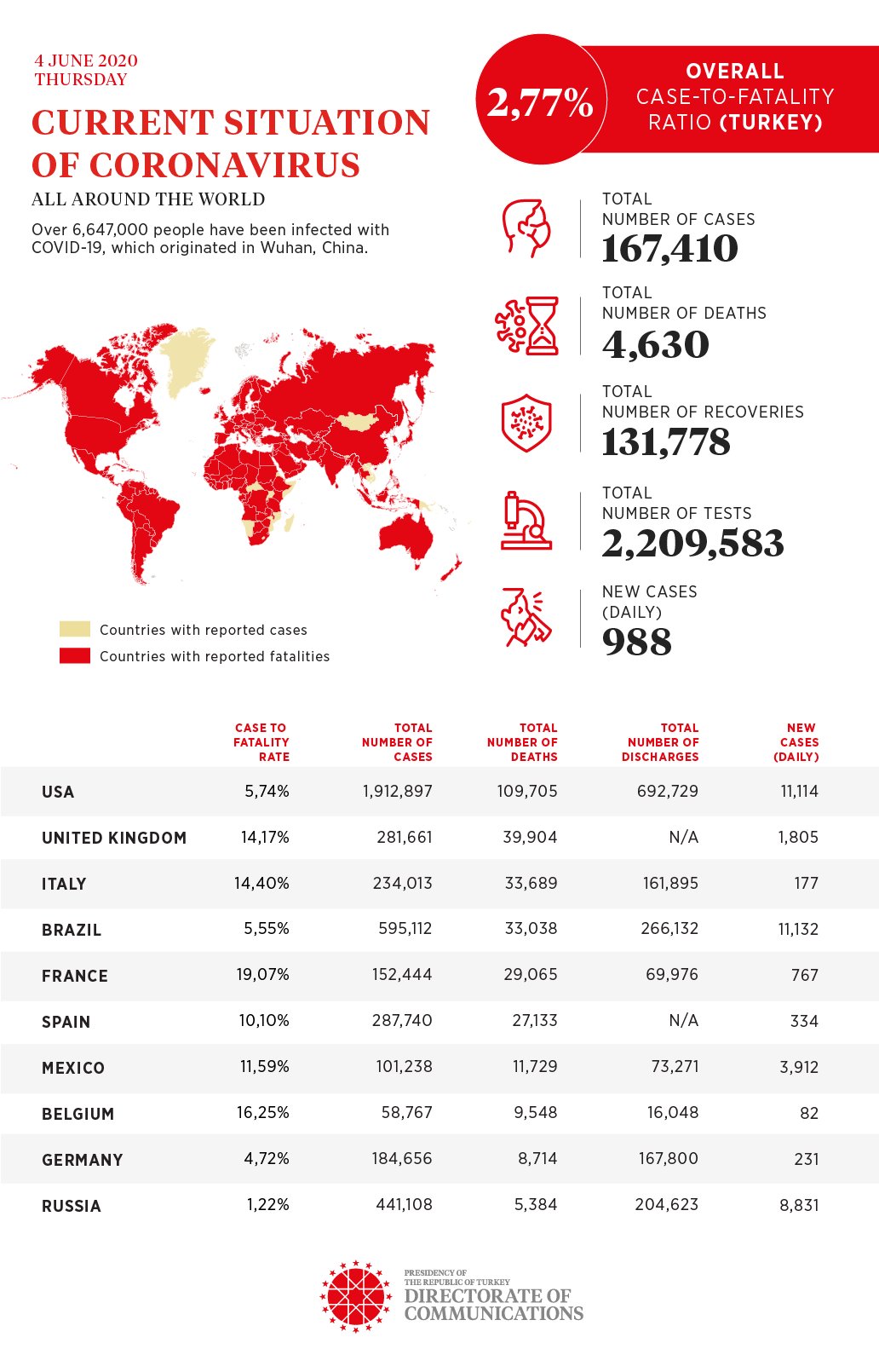 Directorate of Communications announced the number of cases, deaths, and discharges in countries affected by coronavirus (Covid-19) throughout the world as of June 04, 2020, 23:45.