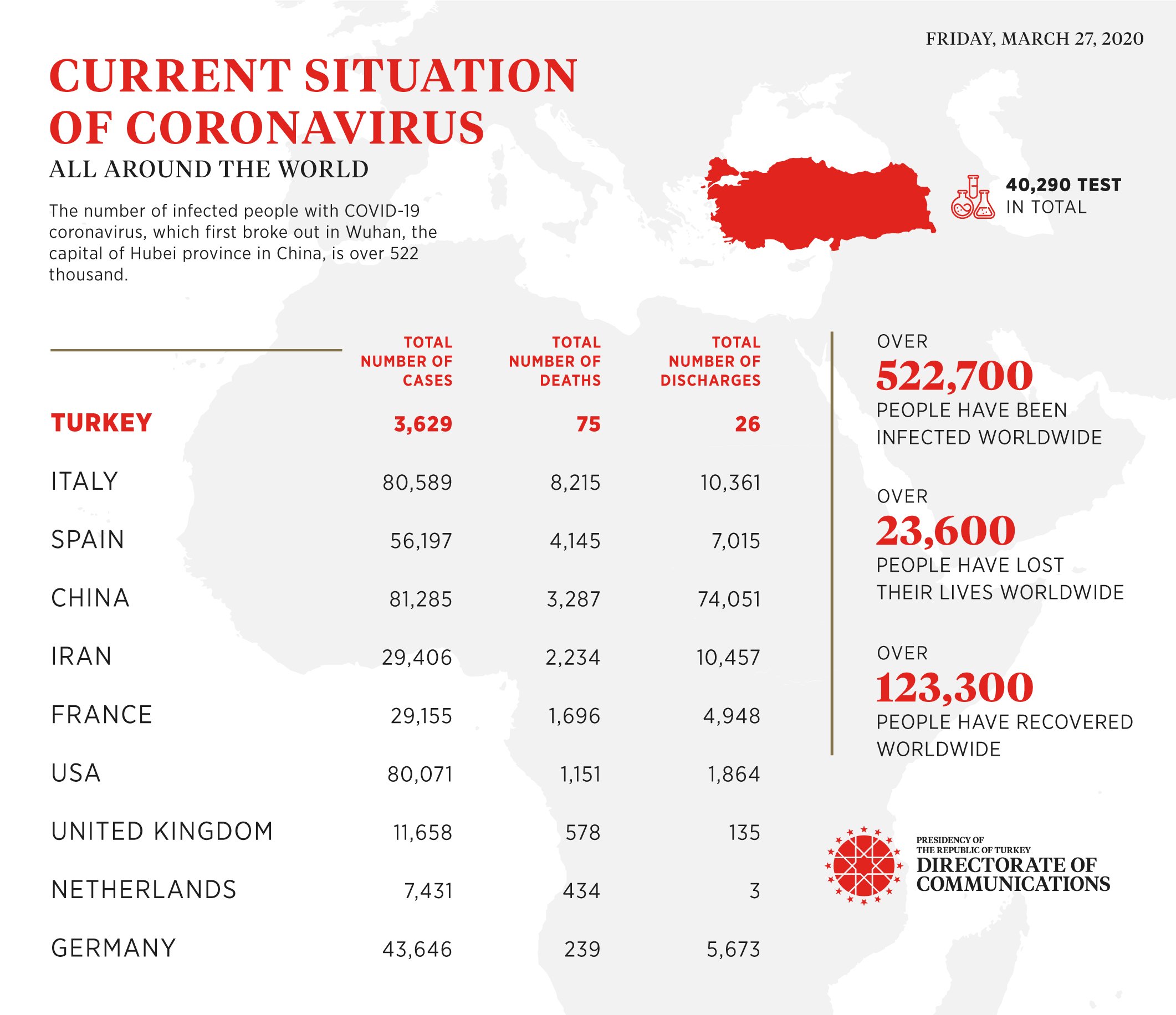 Directorate of Communications announced the number of cases, deaths, and discharges in countries affected by the coronavirus (Covid-19) throughout the world as of March 27, 2020, 00:00.