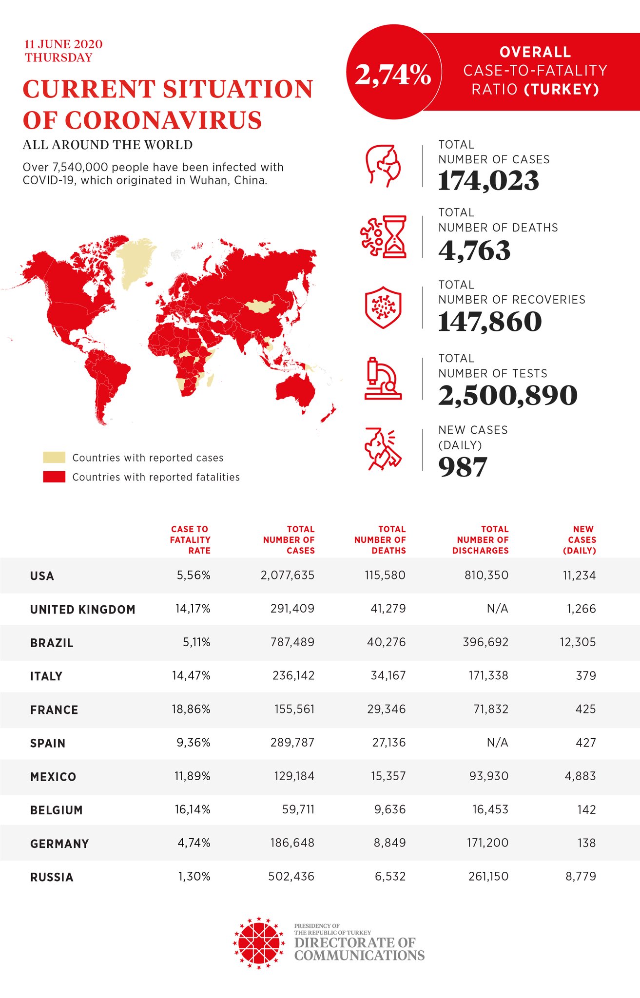 Directorate of Communications announced the number of cases, deaths, and discharges in countries affected by coronavirus (Covid-19) throughout the world as of June 11, 2020, 23:50.