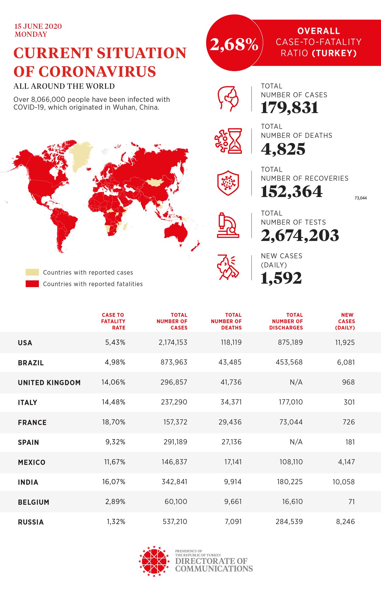 Directorate of Communications announced the number of cases, deaths, and discharges in countries affected by coronavirus (Covid-19) throughout the world as of June 15, 2020, 22:50.