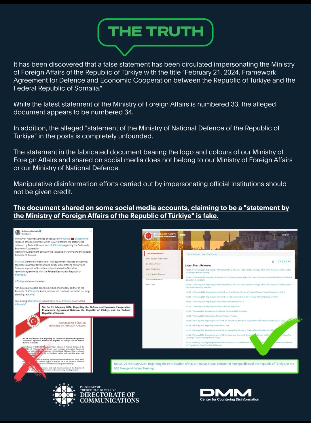 It has been discovered that a false statement has been circulated impersonating the Ministry of Foreign Affairs of the Republic of Türkiye with the title "February 21, 2024, Framework Agreement for Defence and Economic Cooperation between the Republic of Türkiye and the Federal Republic of Somalia."