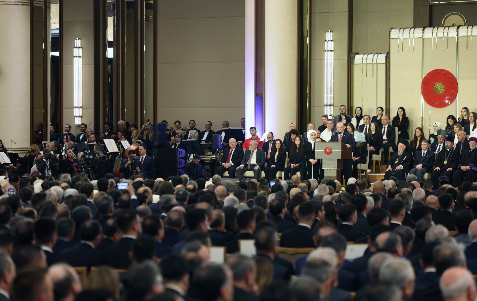 Beginning his remarks by greeting the guests at the exhibition hall, President Erdoğan said: “It is with great pleasure that I welcome you on the occasion of this historic ceremony to the Presidential Complex, the home of the nation, the place that was honored with veteran status on the night of July 15. I would like to thank each and every one of you for honoring our ceremony. At the very beginning of my remarks, I praise my Lord for giving us the opportunity to serve Türkiye and the Turkish nation for another five years.”