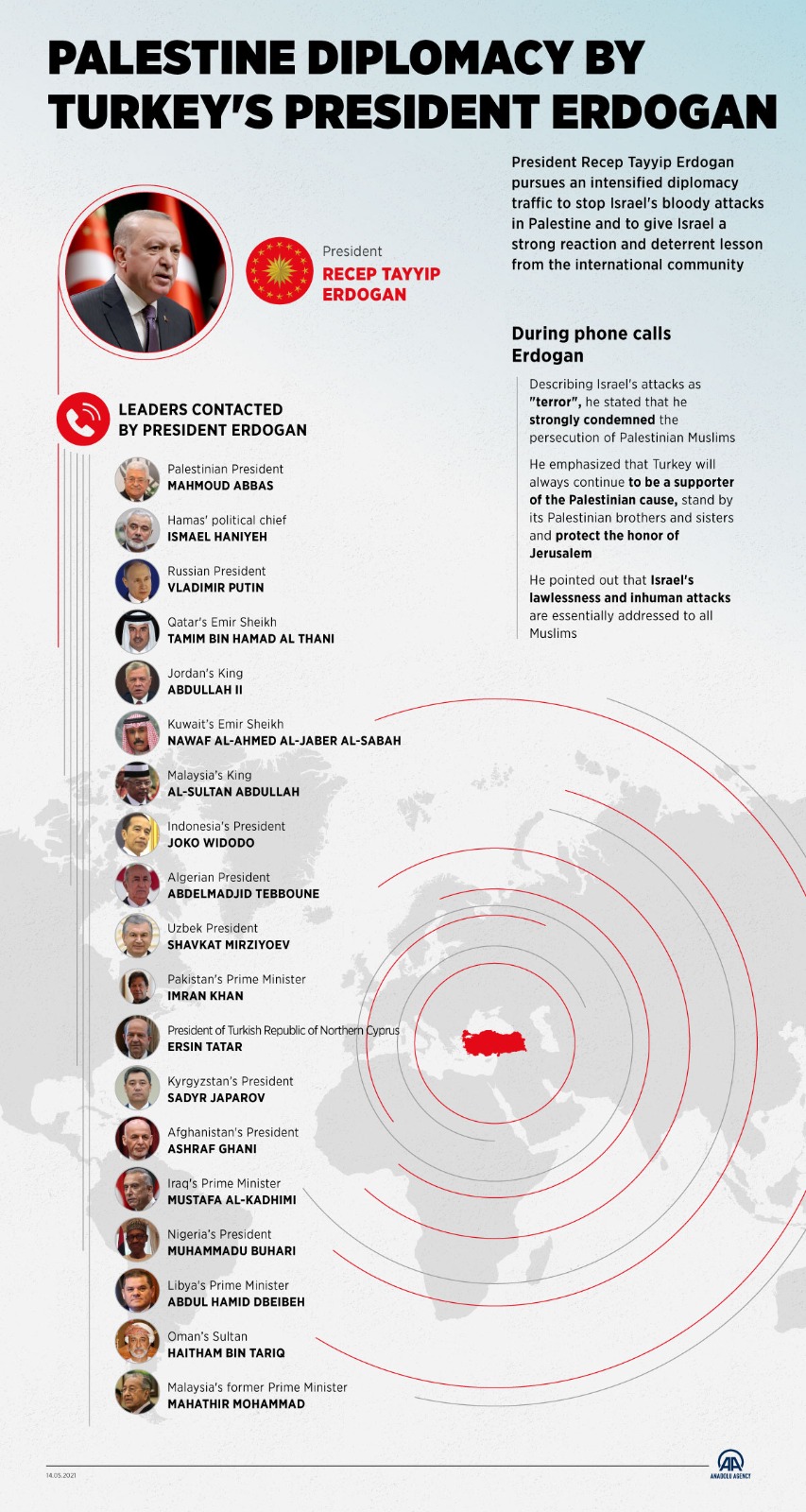 President Erdoğan urged the leaders to take effective and united actions against Israeli attacks and oppression on Palestinian Muslims, Al-Aqsa Mosque, Al-Quds and Gaza. Getting in touch first with President Mahmoud Abbas of Palestine and Head of Hamas Political Bureau Ismail Haniyeh, President Erdoğan has discussed Israel's attacks on Palestine since May 8 with President Vladimir Putin of Russia, Emir Sheikh Tamim bin Hamad Al Thani of Qatar, King Abdullah II of Jordan, Emir of Kuwait Sheikh Nawaf Al-Ahmad Al-Jaber Al-Sabah, King of Malaysia Al-Sultan Abdullah Ri'ayatuddin Al-Mustafa Billah Shah, President Joko Widodo of Indonesia, President Abdelmadjid Tebboune of Algeria, President Shavkat Mirziyoyev of Uzbekistan, Prime Minister Imran Khan of Pakistan, President Ersin Tatar of the Turkish Republic of Northern Cyprus, President Sadyr Japarov of Kyrgyzstan, President Ashraf Ghani of Afghanistan, Prime Minister Mustafa al-Kadhimi of Iraq, President Muhammadu Buhari of Nigeria, Prime Minister Abdul Hamid Dbeibeh of the Government of Unity of Libya, Sultan Haitham bin Tariq of Oman, former Prime Minister Mahathir Mohamad of Malaysia.