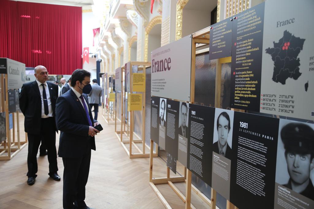 The exhibition, which depicts the terrorist attacks and assassinations carried out by Armenian terrorists with country-based and city-based graphics and historical timelines on panels, also features special visuals that include high-resolution photos upscaled with artificial intelligence technologies and stories of the martyred diplomats.