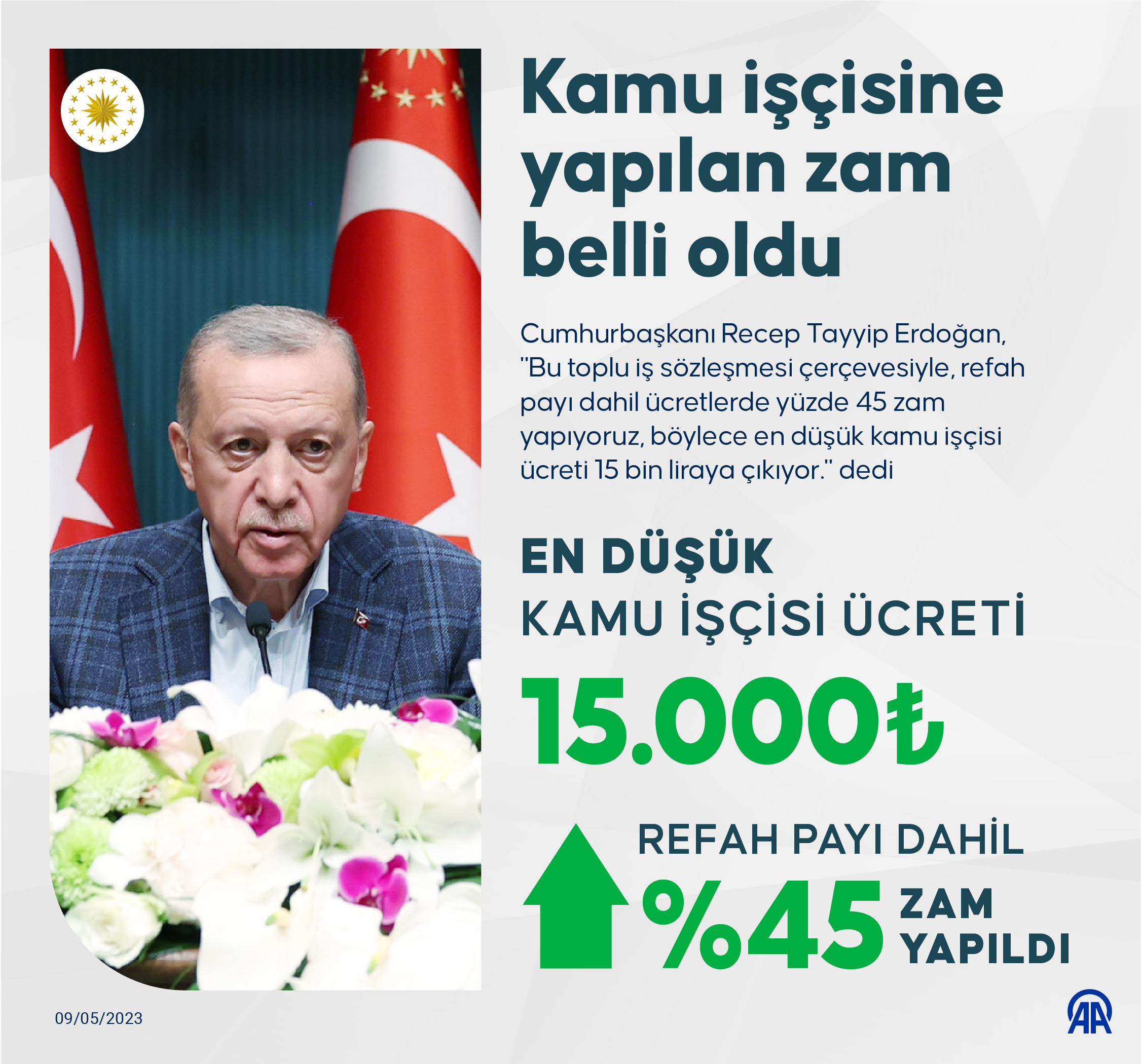 Speaking at the 2023 Public Collective Labor Agreement Signing Ceremony, President Recep Tayyip Erdoğan said: "We are increasing wages by 45 percent, including the welfare share. Thus, we are raising the lowest public worker wage to TL15 thousand."
