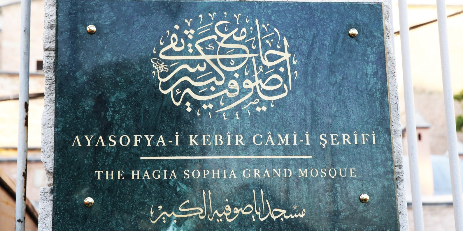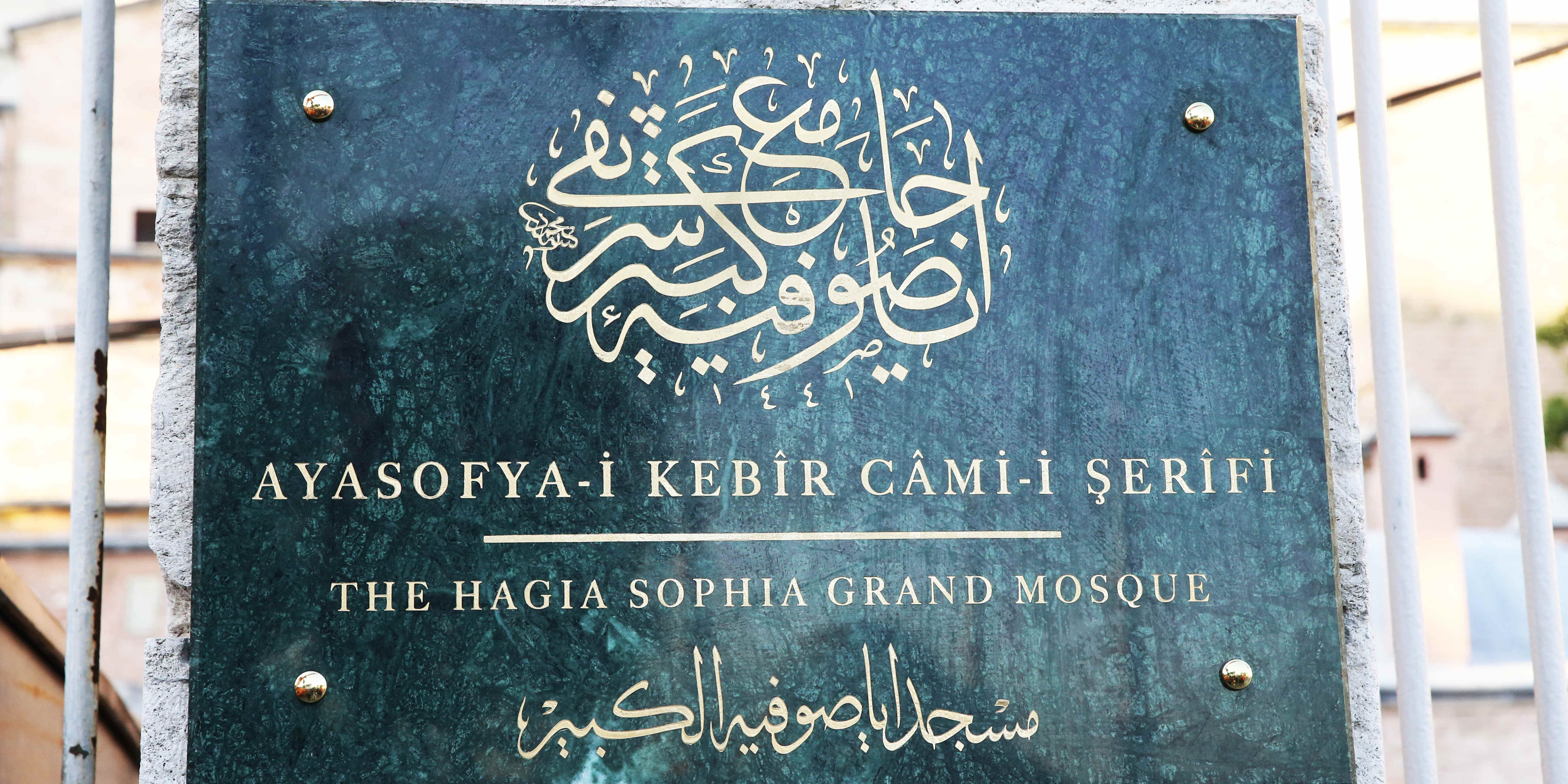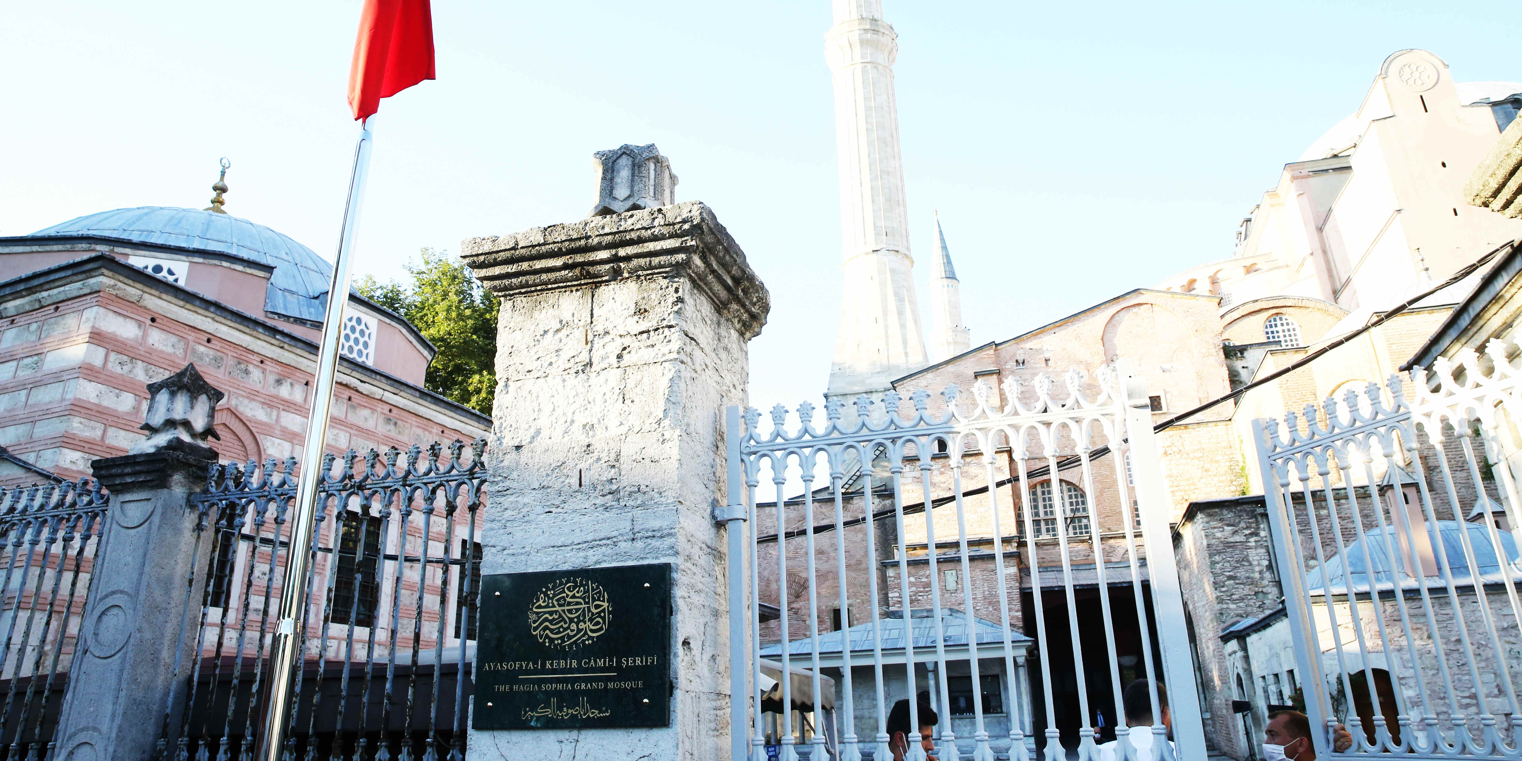 Erdoğan and his accompanying delegation went to the entrance of the Hagia Sophia Mosque and unveiled the nameplate that said “The Hagia Sophia Grand Mosque”.