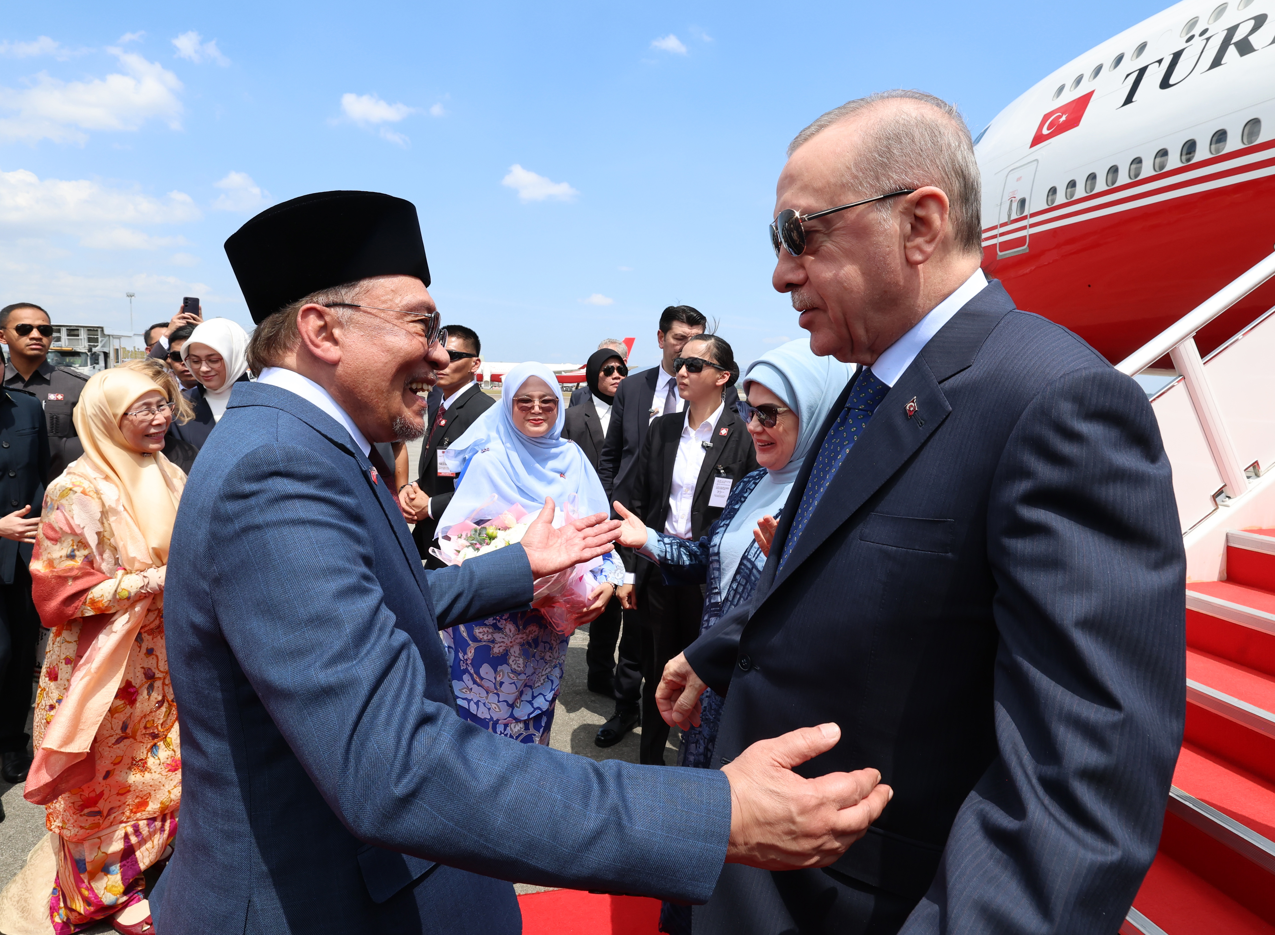President Erdoğan was welcomed at Kuala Lumpur International Airport by Prime Minister Anwar Ibrahim of Malaysia, Türkiye’s Ambassador to Kuala Lumpur Emir Salim Yüksel, Minister of Defence Mohamed Khaled Nordin of Malaysia, and other officials.