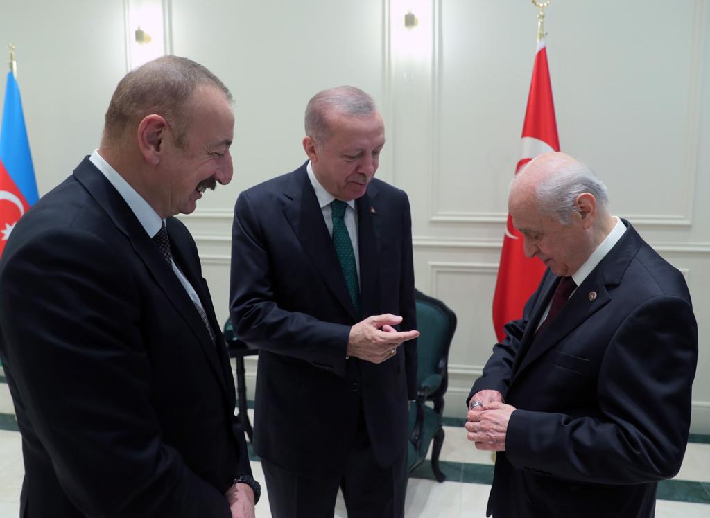 Chairman of the Nationalist Movement Party (MHP) Devlet Bahçeli spent some time conversing with President Erdoğan and President Aliyev during the final portion of the meeting.