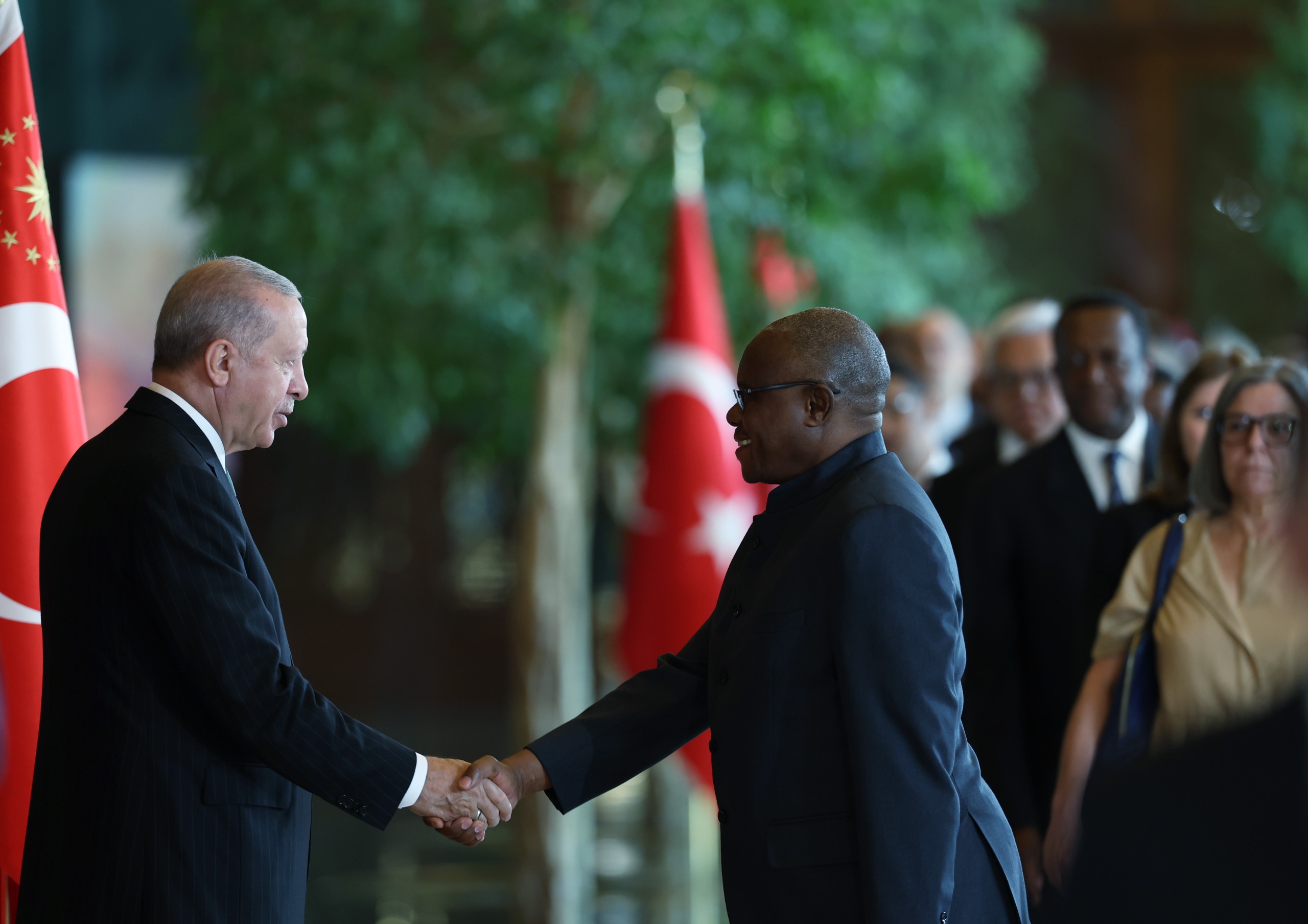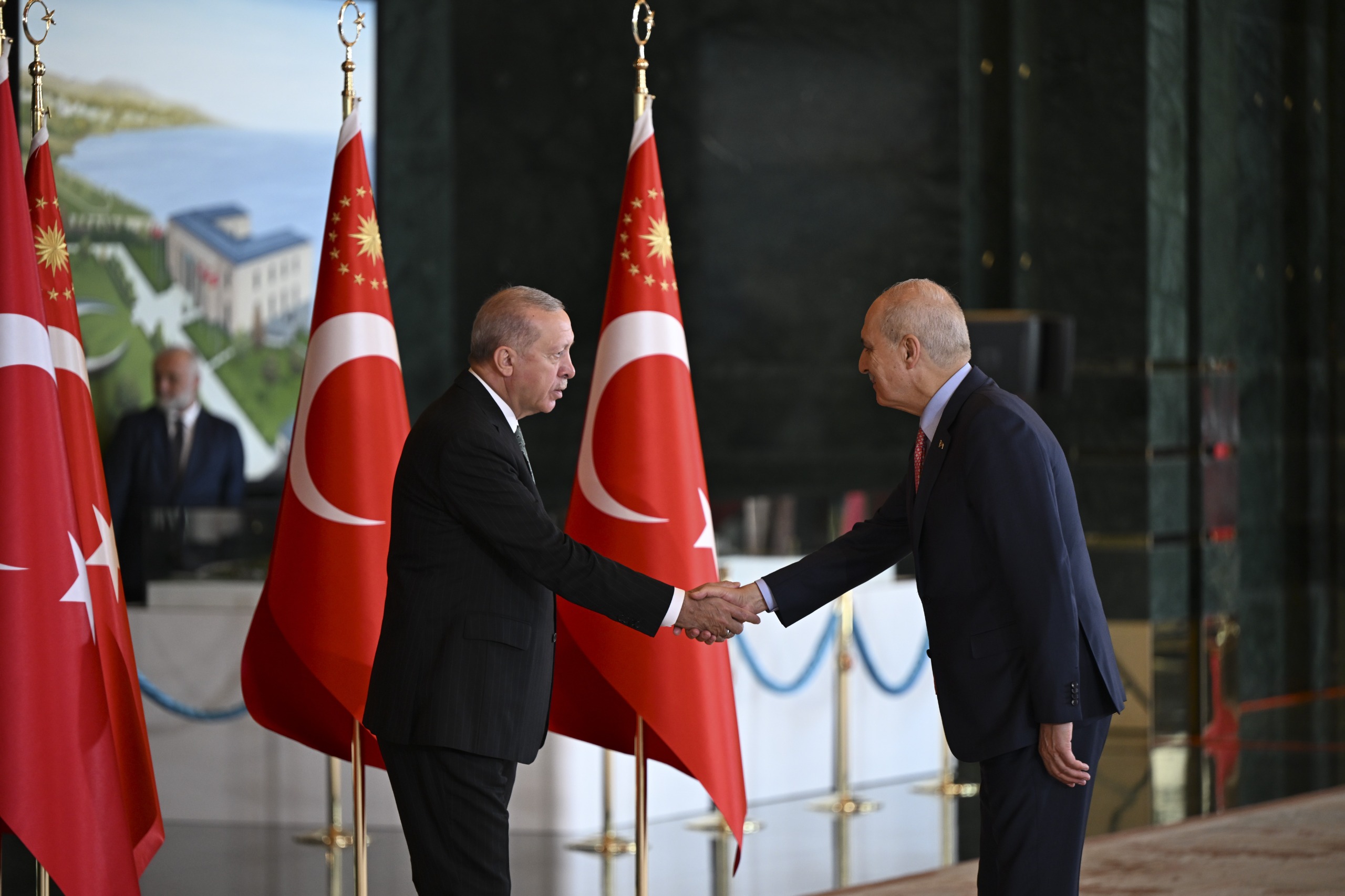 Speaker of the Grand National Assembly of Türkiye (GNAT) Numan Kurtulmuş, Vice President Cevdet Yılmaz, President of the Constitutional Court Kadir Özkaya, President of the Court of Cassation Ömer Kerkez, President of the Council of State Zeki Yiğit, President of the Court of Accounts Metin Yener, Chairman of the Nationalist Movement Party (MHP) Devlet Bahçeli, members of the Presidential Cabinet, deputy speakers of the GNAT, Chief of General Staff Gen. Selçuk Bayraktaroğlu, force commanders, other high-ranking state officials, including administrators of public institutions, foreign chiefs of mission, representatives of international organizations offered their congratulations to President Erdoğan at the ceremony.