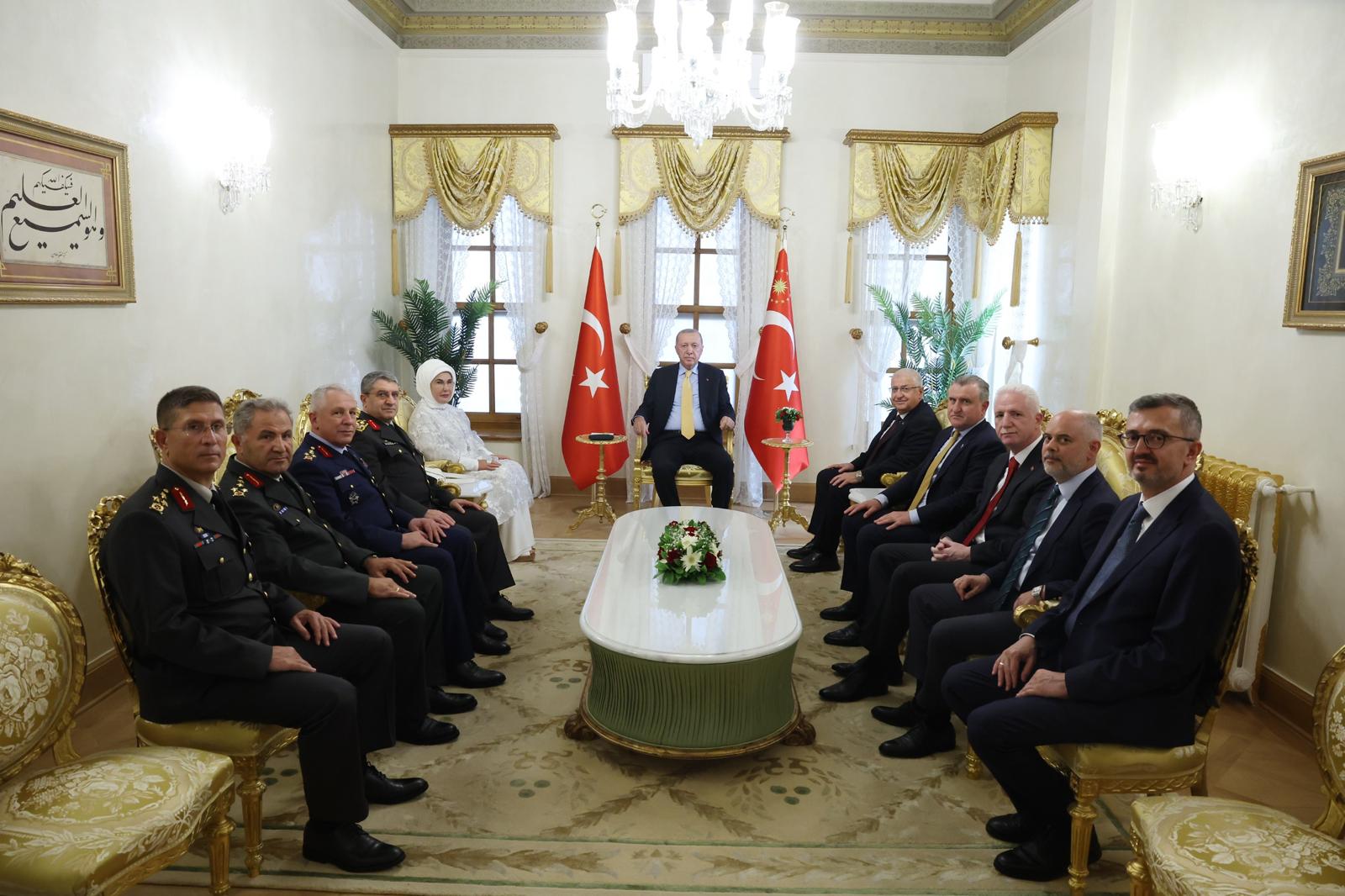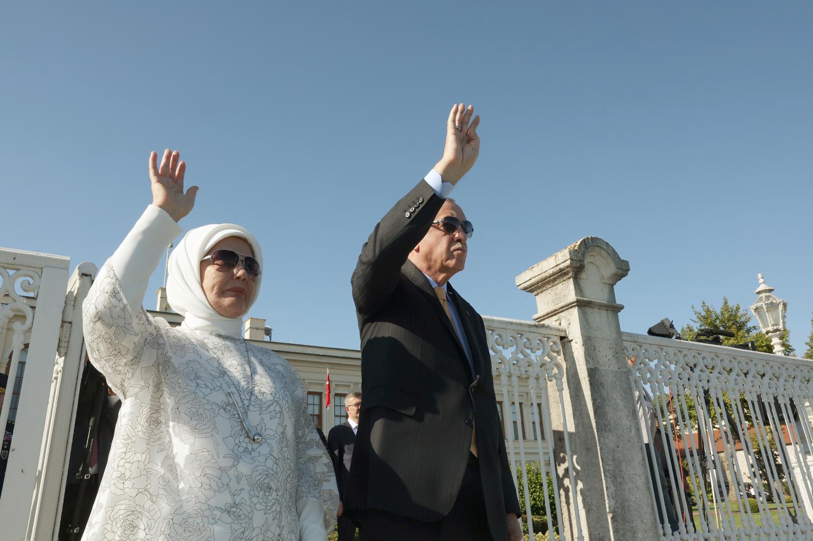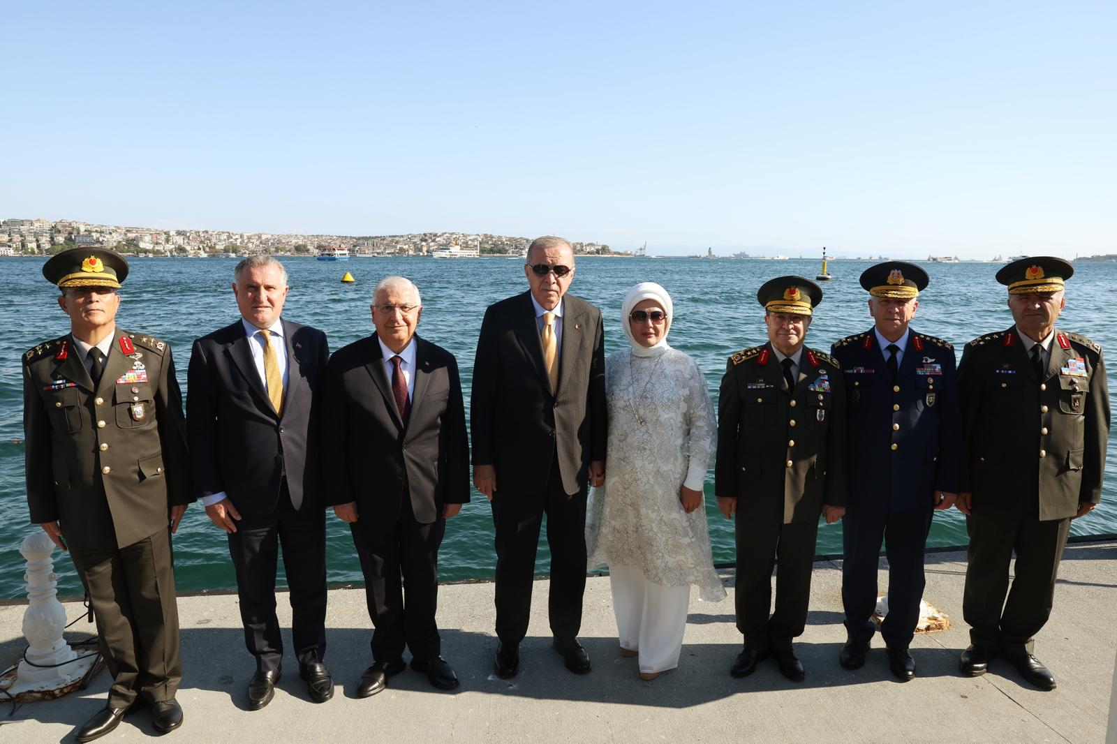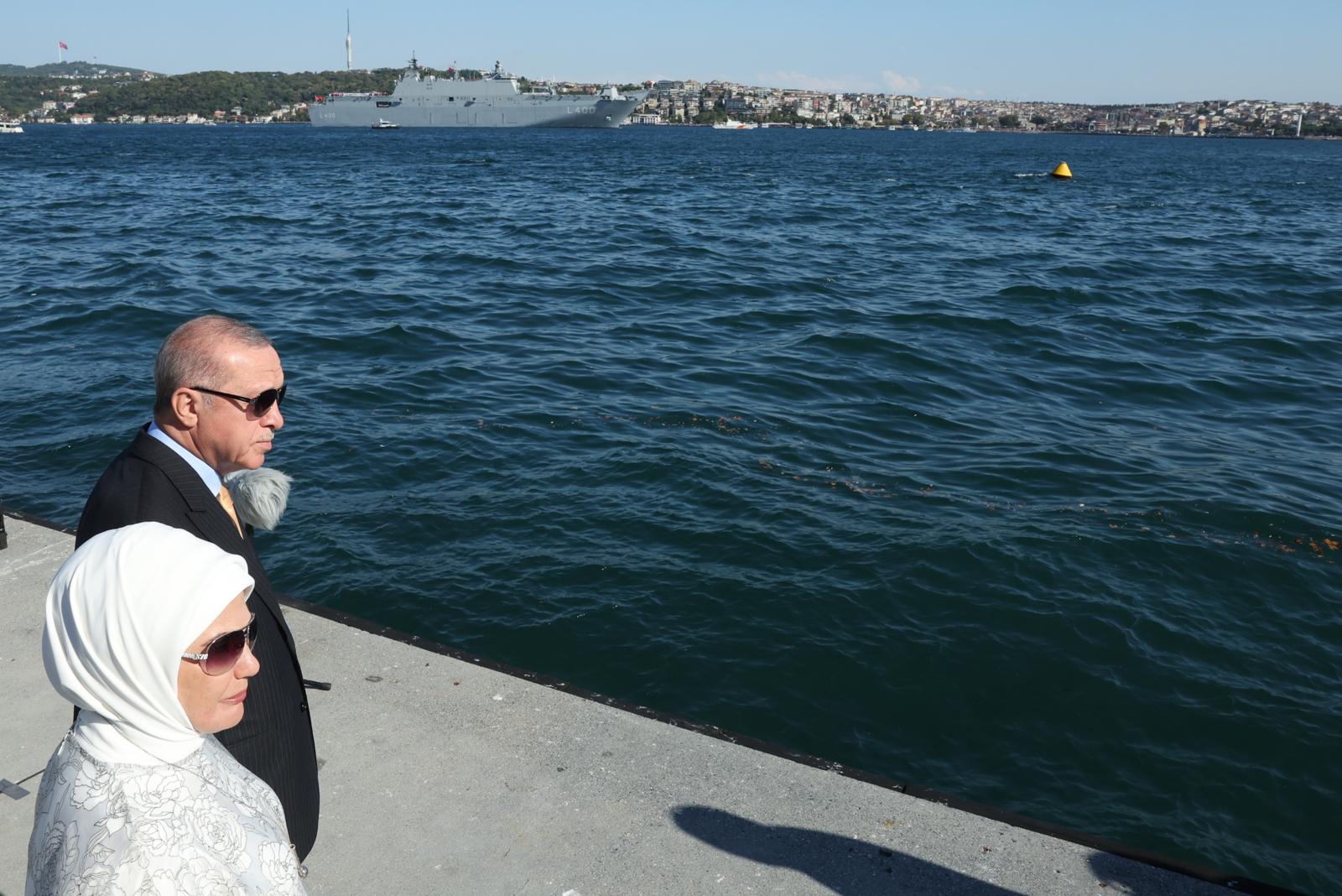 First Lady Emine Erdoğan accompanied President Erdoğan as he saluted the vessels from Dolmabahçe Presidential Office.