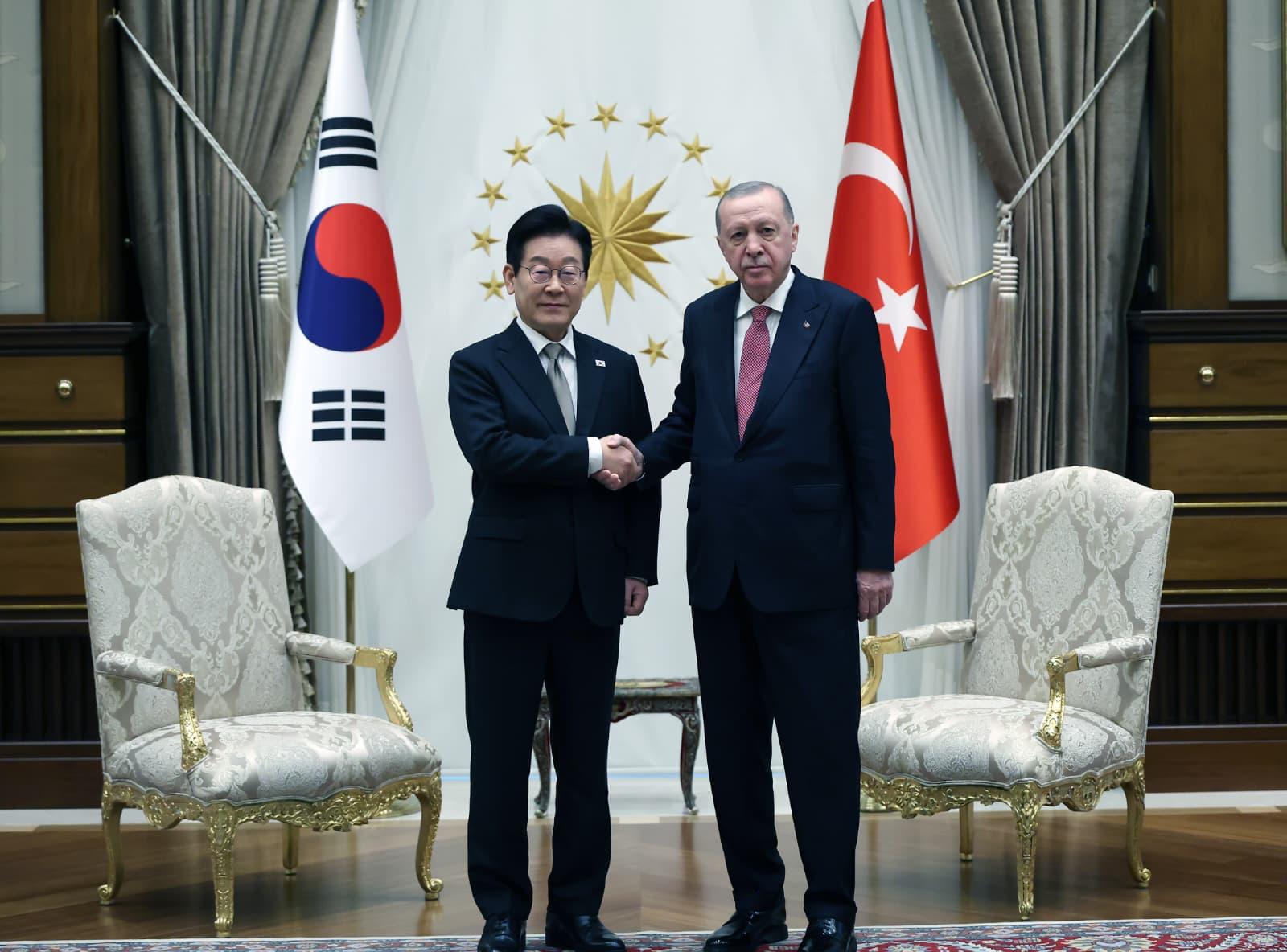 Once the two leaders arrived at the ceremonial ground, the national anthems of Türkiye and the Republic of Korea were played, and President Lee inspected the guard of honor.