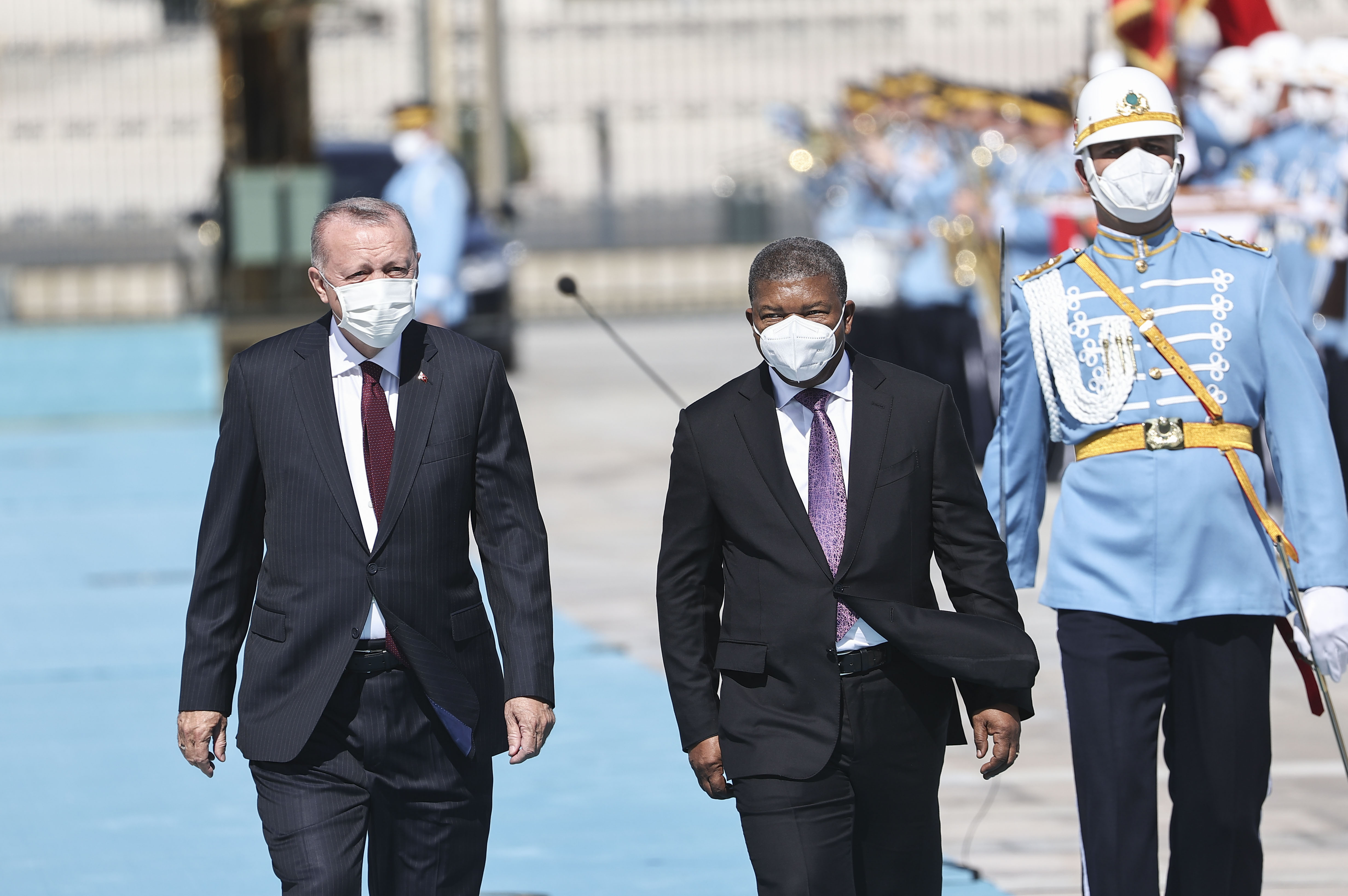 After the national anthems of Turkey and Angola were played and 21-gun-salute was fired, President Lourenço of Angola inspected the guard of honor.