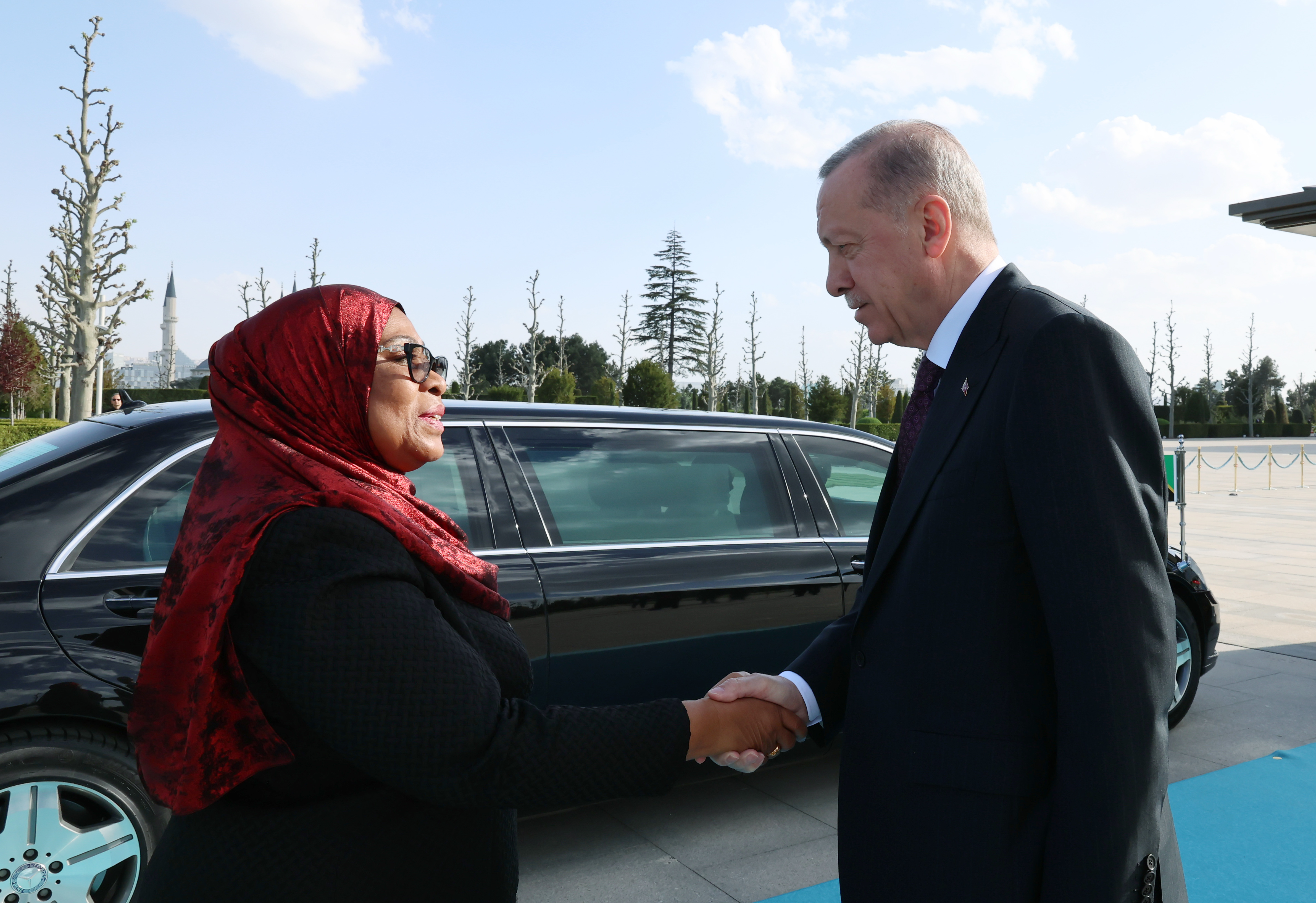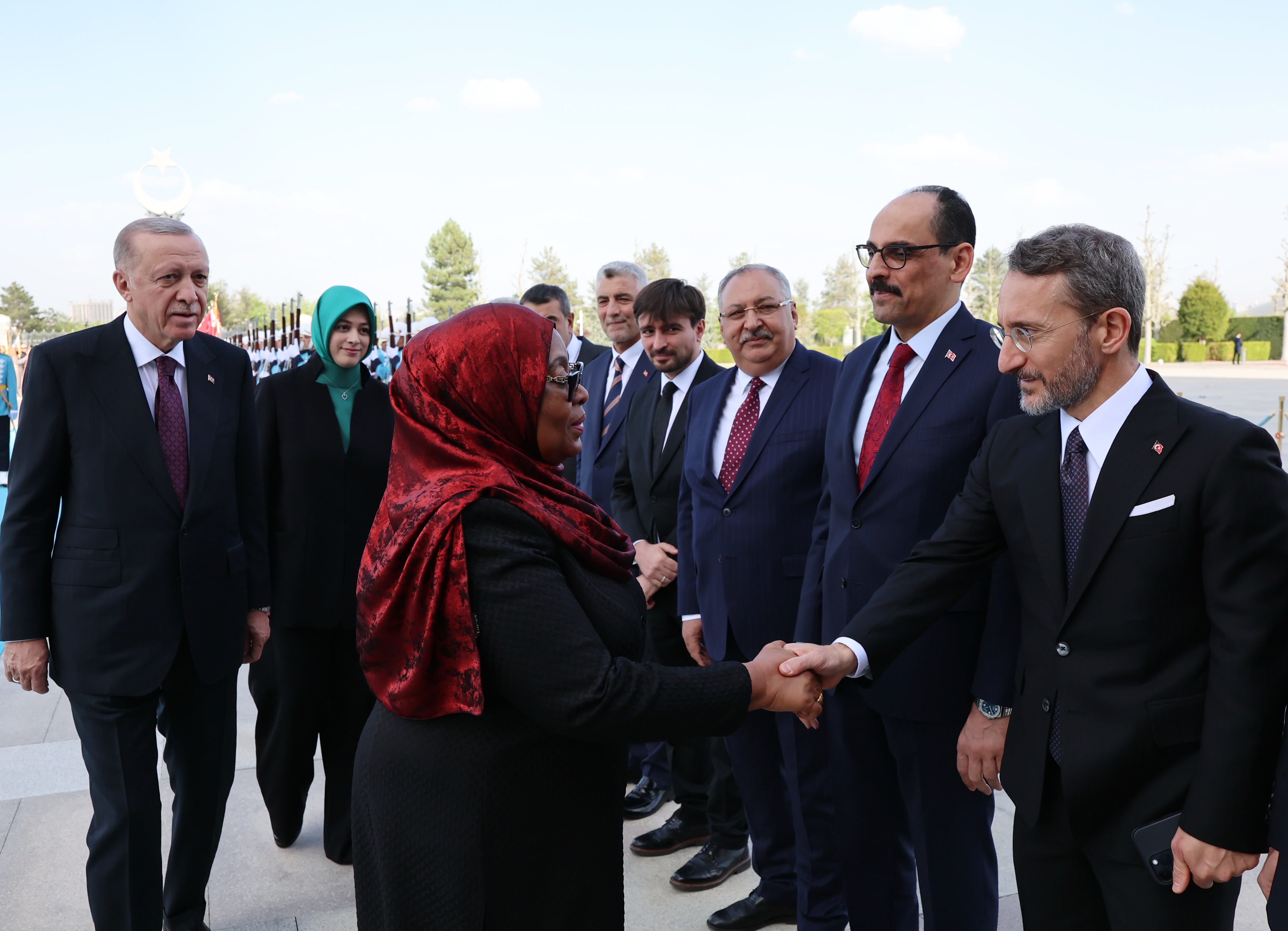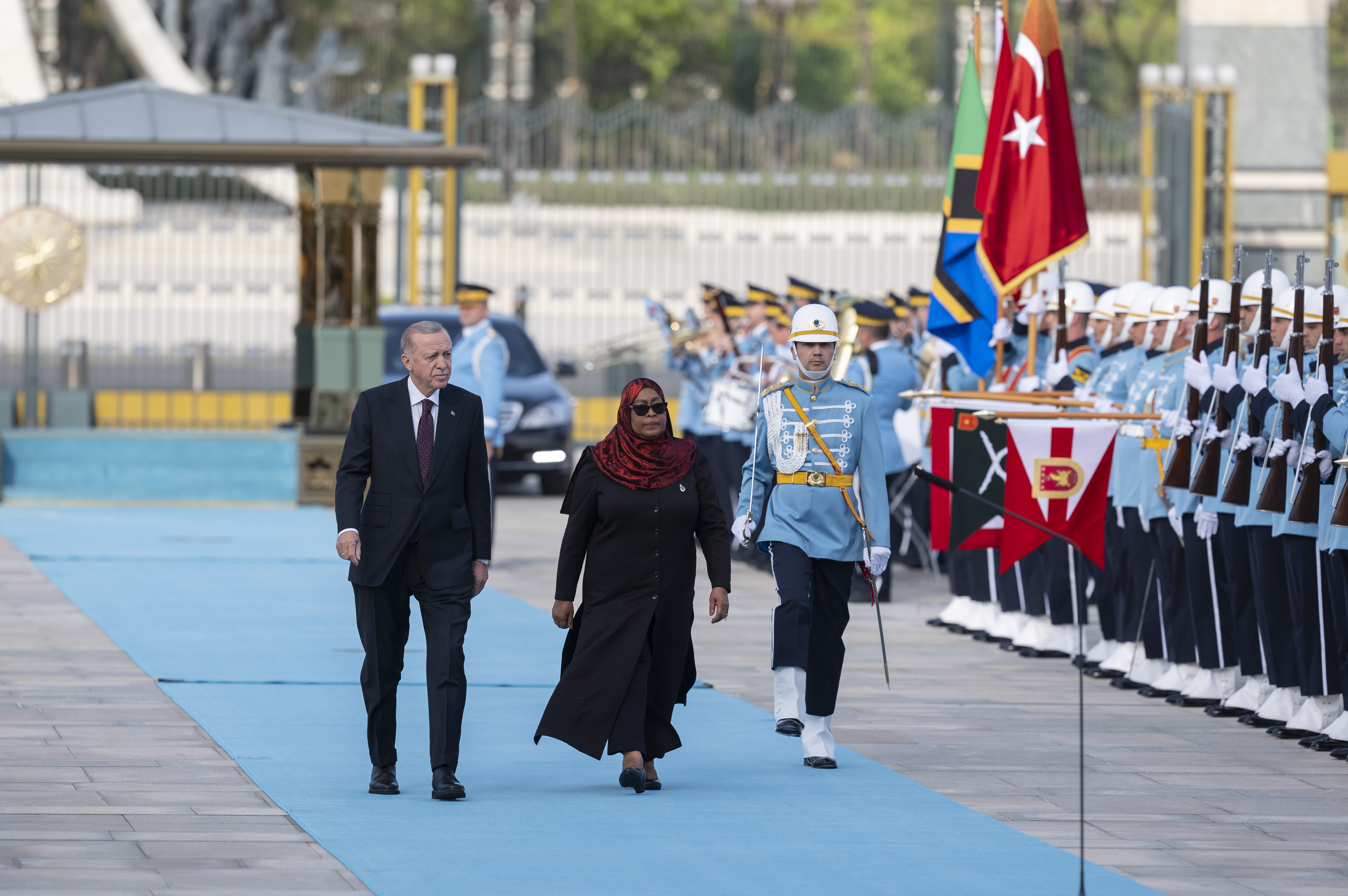 Once the two leaders arrived at the ceremonial ground, the national anthems of Türkiye and Tanzania were played and President Suluhu Hassan inspected the guard of honor.