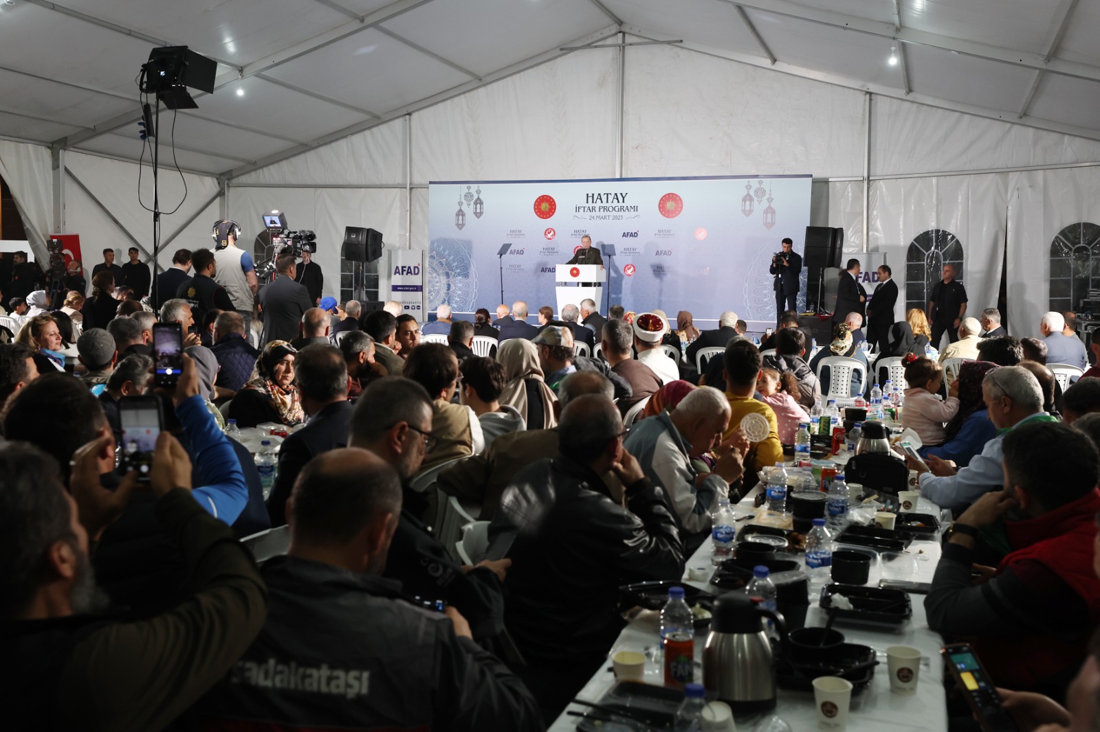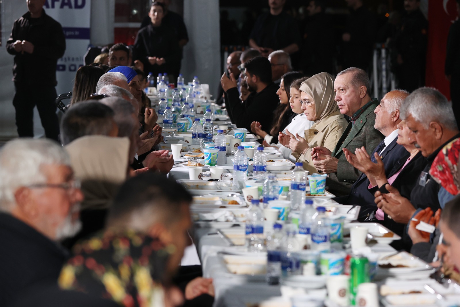 President Recep Tayyip Erdoğan and Nationalist Movement Party (MHP) Chairman Devlet Bahçeli shared iftar with quake victims in Büyükdalyan Container City in Hatay.