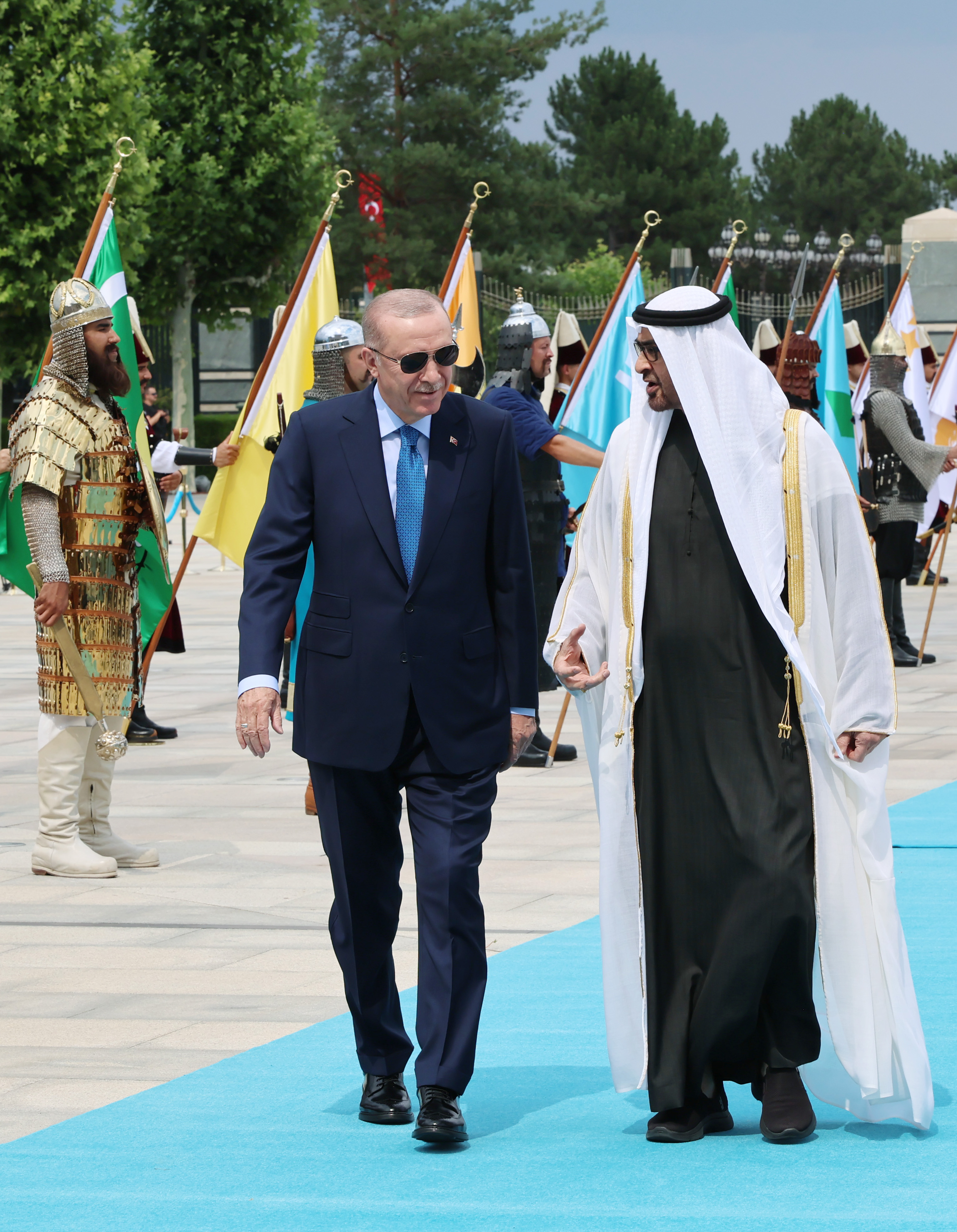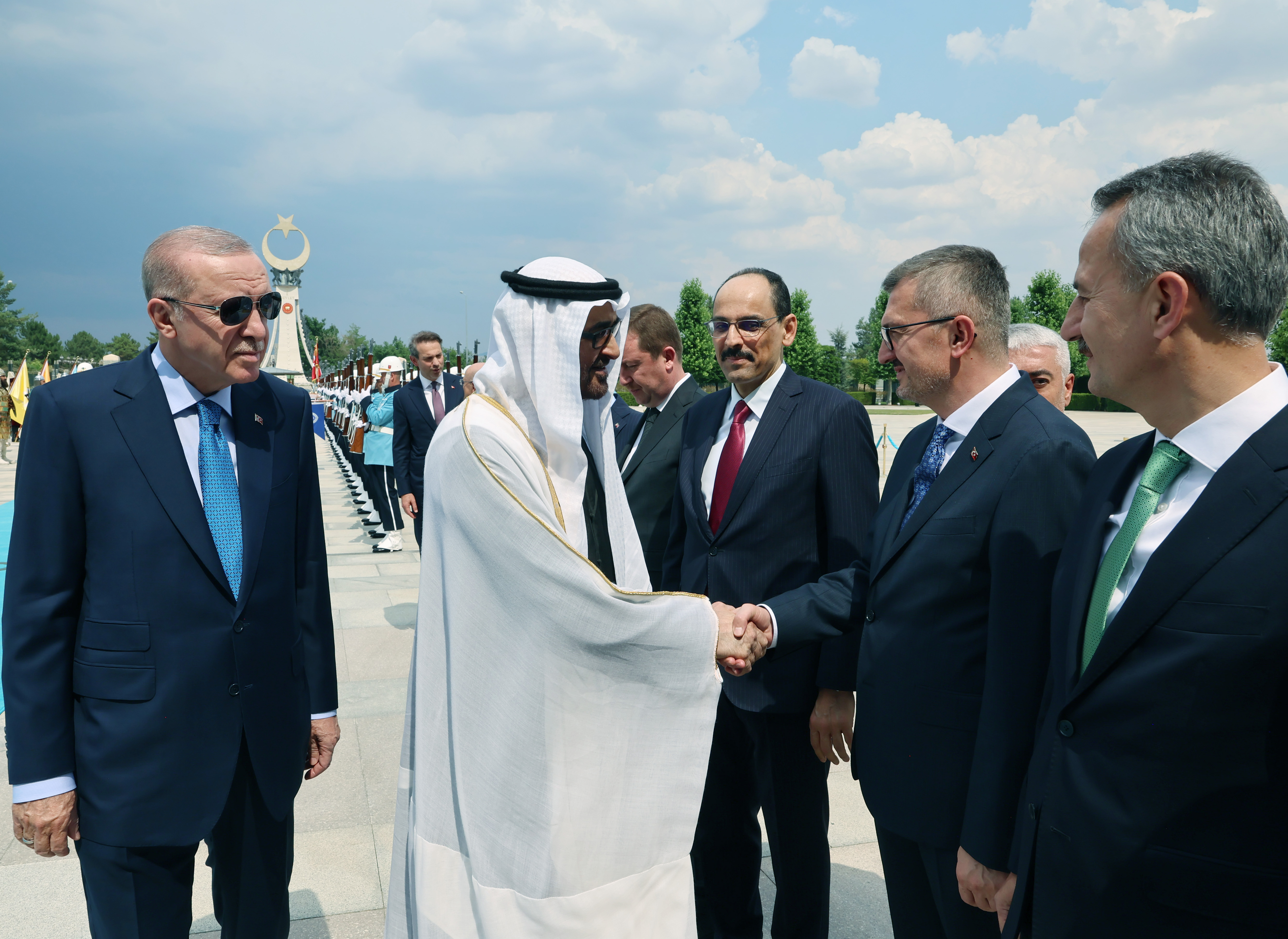 Once the two leaders arrived at the ceremonial ground, the national anthems of Türkiye and the UAE were played, and UAE President Sheikh Mohammed bin Zayed Al Nahyan inspected the guard of honor.