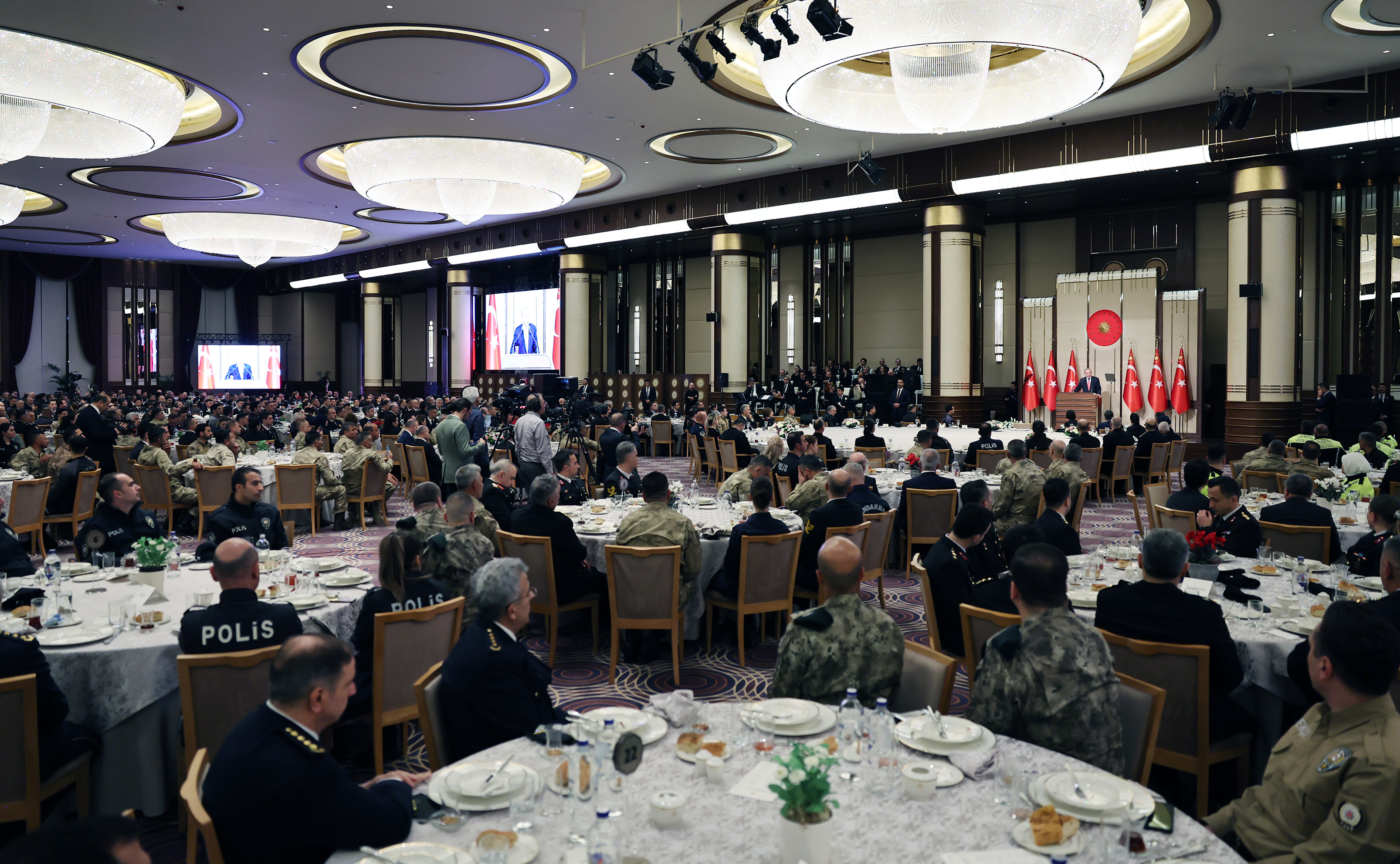 President Recep Tayyip Erdoğan delivered remarks at an iftar dinner with police, gendarmerie and coast guard personnel at the Exhibition Hall of the Presidential Complex.