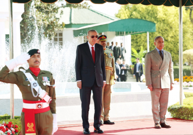 President Recep Tayyip Erdoğan, who is in Pakistan for official talks, was welcomed with an official ceremony by Prime Minister Shehbaz Sharif of Pakistan. Once the two leaders arrived at the ceremonial ground, the national anthems of Türkiye and Pakistan were played, and President Erdoğan inspected the guard of honor. Following the introduction of the delegations, President Erdoğan and Prime Minister Sharif proceeded to their bilateral meeting and the meeting between the delegations. Source: Presidency of the Republic of Türkiye