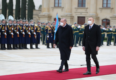 President Recep Tayyip Erdoğan, who is in Baku for an official visit, was welcomed with an official ceremony by President Ilham Aliyev of Azerbaijan. President Aliyev of Azerbaijan greeted President Erdoğan as he got out of his official car for the welcoming ceremony held at the Youth Palace. The national anthems of both countries were played after President Erdoğan and President Aliyev had taken their places at the parade ground. Watching the military parade, President Erdoğan saluted the guard of honor with his counterpart Aliyev. Following the introduction of delegations and watching the military...