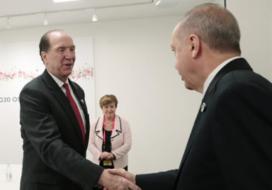 President Recep Tayyip Erdoğan received President of the World Bank, David Malpass on the sidelines of the G20 Osaka Summit. Minister of Foreign Affairs Mevlüt Çavuşoğlu and Minister of Treasury and Finance Berat Albayrak were also present at the meeting at he International Exhibition Center (INTEX). https://www.tccb.gov.tr/en/news/542/105813/president-erdogan-receives-world-bank-president-malpass