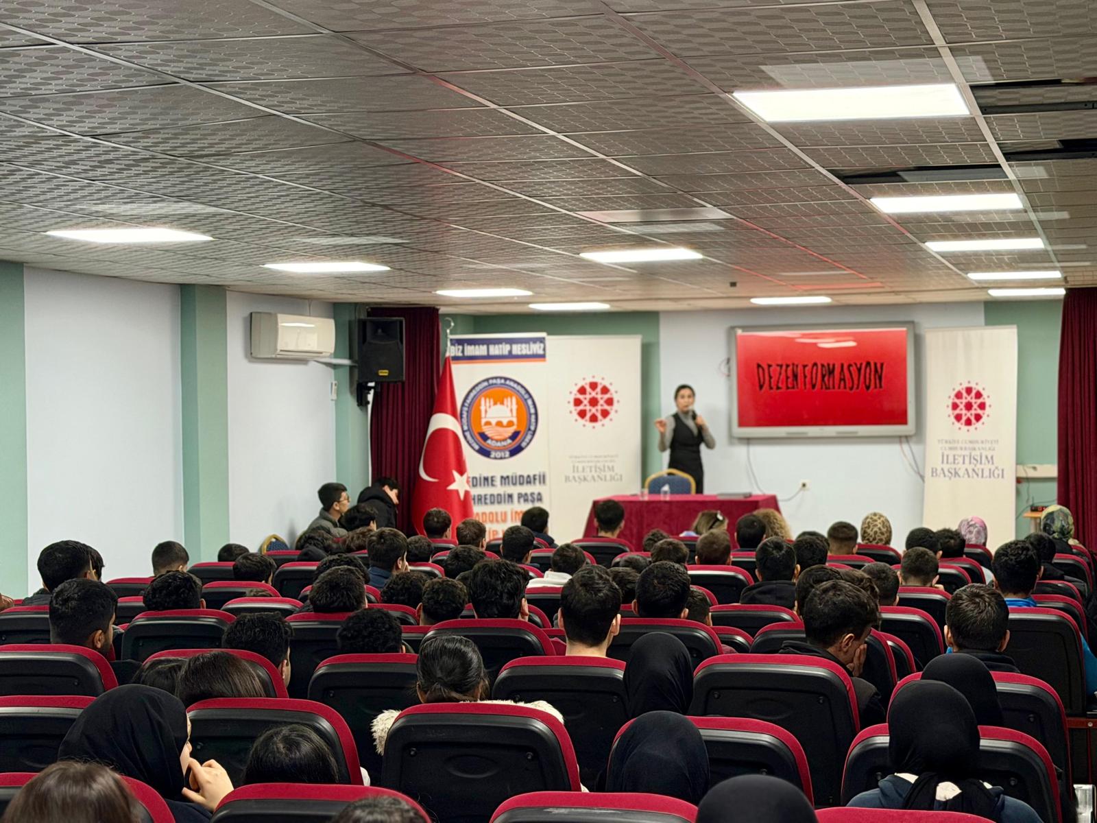 Eğitimde ayrıca, dezenformasyonun dijital platformlarda hızlı bir şekilde yayılabildiği ve bireyler üzerinde olumsuz etkiler oluşturabileceği ifade edildi. Öğrencilere, sosyal medyada karşılaşılan içeriklere karşı dikkatli olunması, bilgilerin doğruluğunun araştırılması ve bilinçli paylaşım yapılmasının önem taşıdığı aktarıldı.