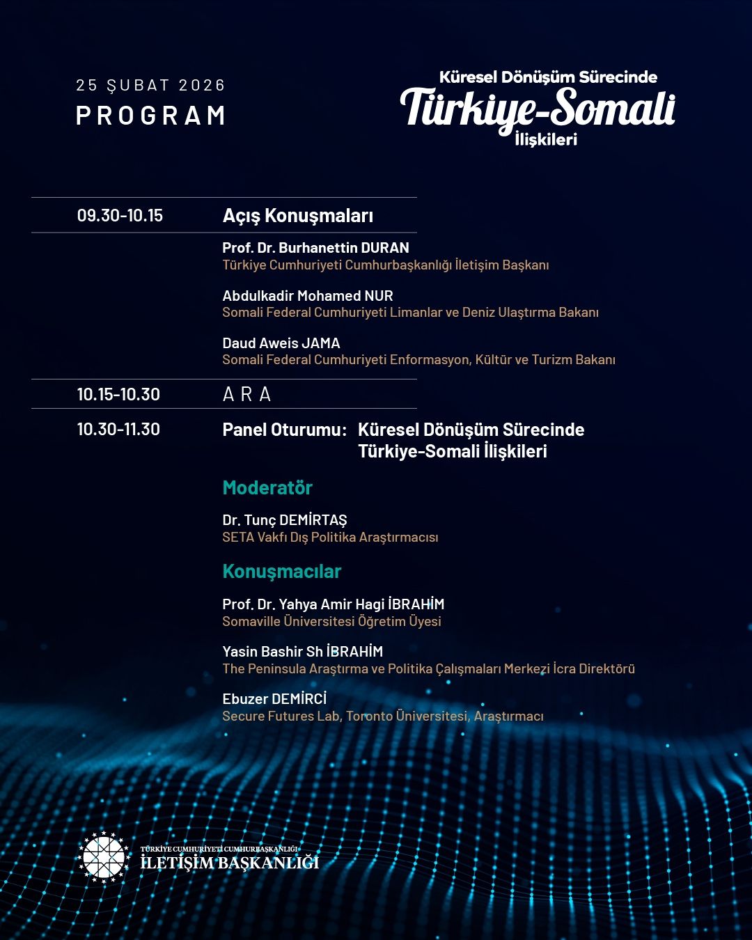 Başkanlığımız, Türkiye-Somali ilişkilerinin mevcut durumunun ele alınması ve geleceğe yönelik iş birliği imkanlarının kapsamlı biçimde değerlendirilmesi amacıyla 25 Şubat 2026 tarihinde Ankara’da, Cumhurbaşkanlığı İletişim Başkanlığı Konferans Salonu’nda bir panel düzenleyecektir.