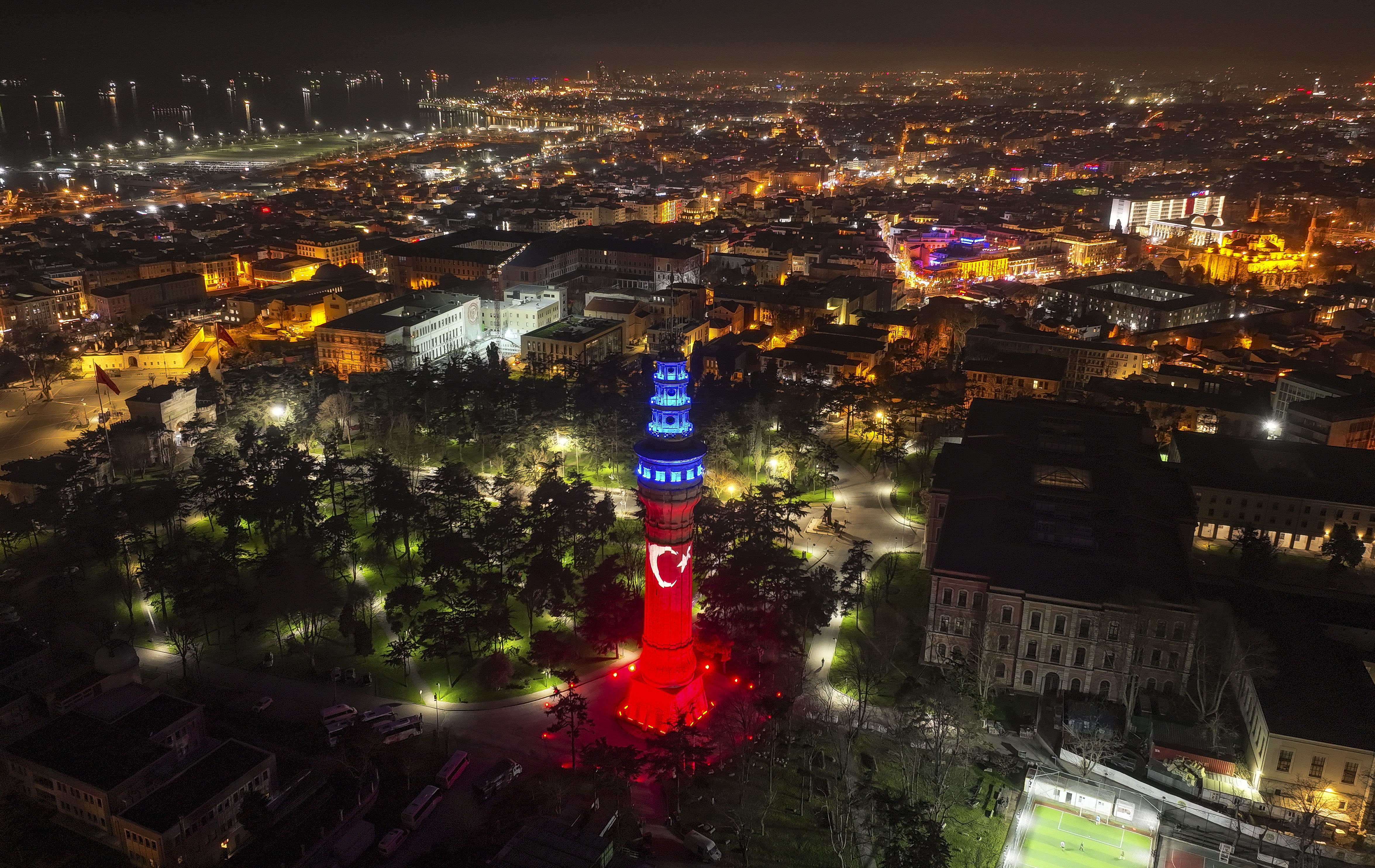 18 Mart Şehitleri Anma Günü ve Çanakkale Deniz Zaferi nedeniyle Deniz Müzesi ve Beyazıt İtfaiye Kulesi'ne Türk bayrağı yansıtıldı.