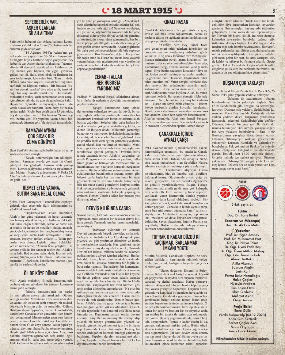 Hikâyeler ve görsellerle donatılan gazetede, 18 Mart 1915'e kadar geçen süreç, Çanakkale Savaşları'nda yaşananlar, cephede cereyan eden ve bugüne kadar hiç söz edilmemiş anılara yer verildi.