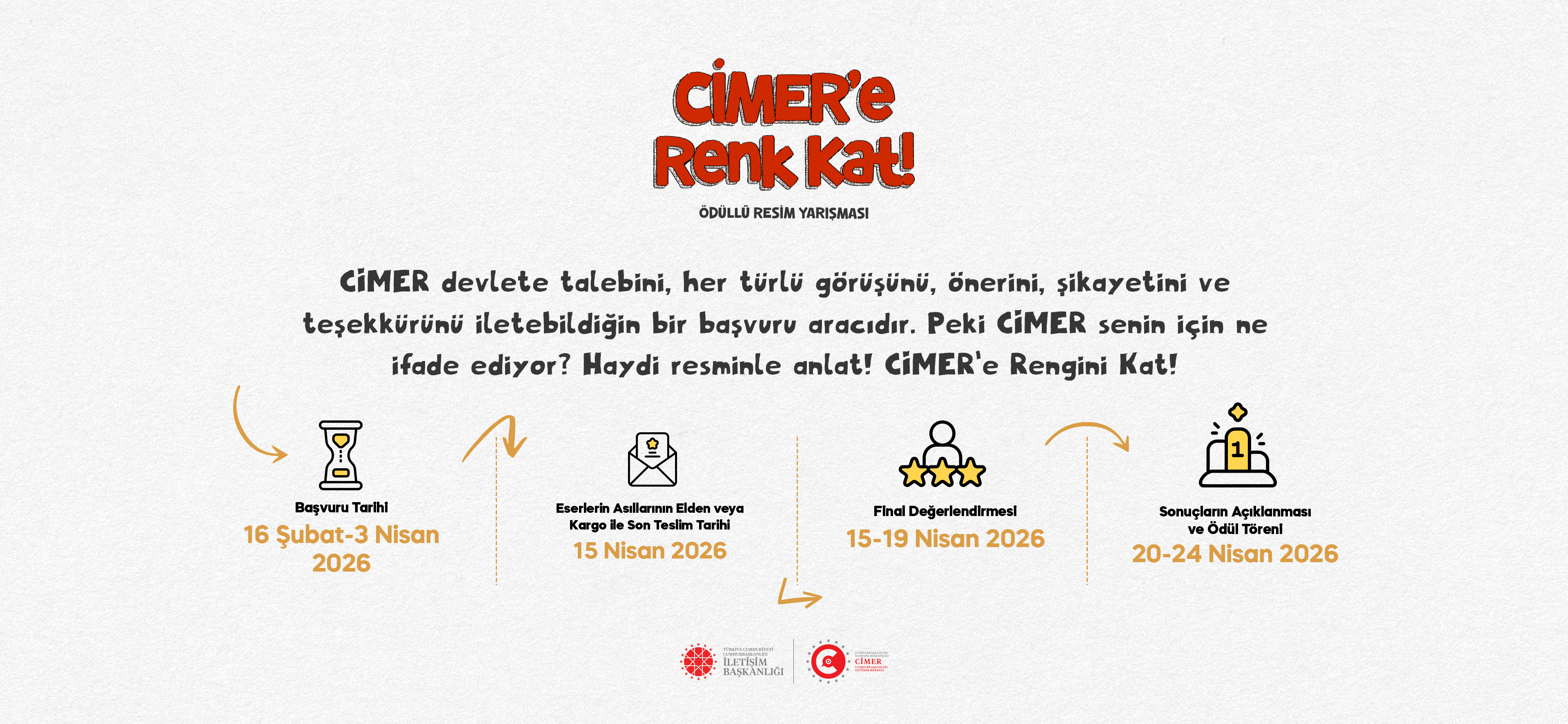 “CİMER’e Renk Kat” Ödüllü Resim Yarışması'na başvurular 16 Şubat’ta alınmaya başlandı. İlkokul ve ortaokul öğrencileri son başvuru tarihi olan 3 Nisan 2026’ya kadar çizdikleri resimleri JPG, PNG ve PDF formatında yükleyerek başvurularını tamamlayabilecekler. Pastel boya, sulu boya, guaj boya, gazlı kalem, kara kalem ya da serbest teknikte, en az A4 boyutlarındaki bir kağıda çizilmesi istenen resimlerin asıllarının elden veya kargo ile teslimi için ise son tarih 15 Nisan 2026 olarak belirlendi. 15-19 Nisan 2026’da yapılacak final değerlendirmeleri ardından sonuçlar 20-24 Nisan tarihlerinde açıklanacak. Birinci, ikinci ve üçüncü seçilen resimlerin sahiplerine, düzenlenecek ödül töreninde, sürpriz ödüller verilecek.
