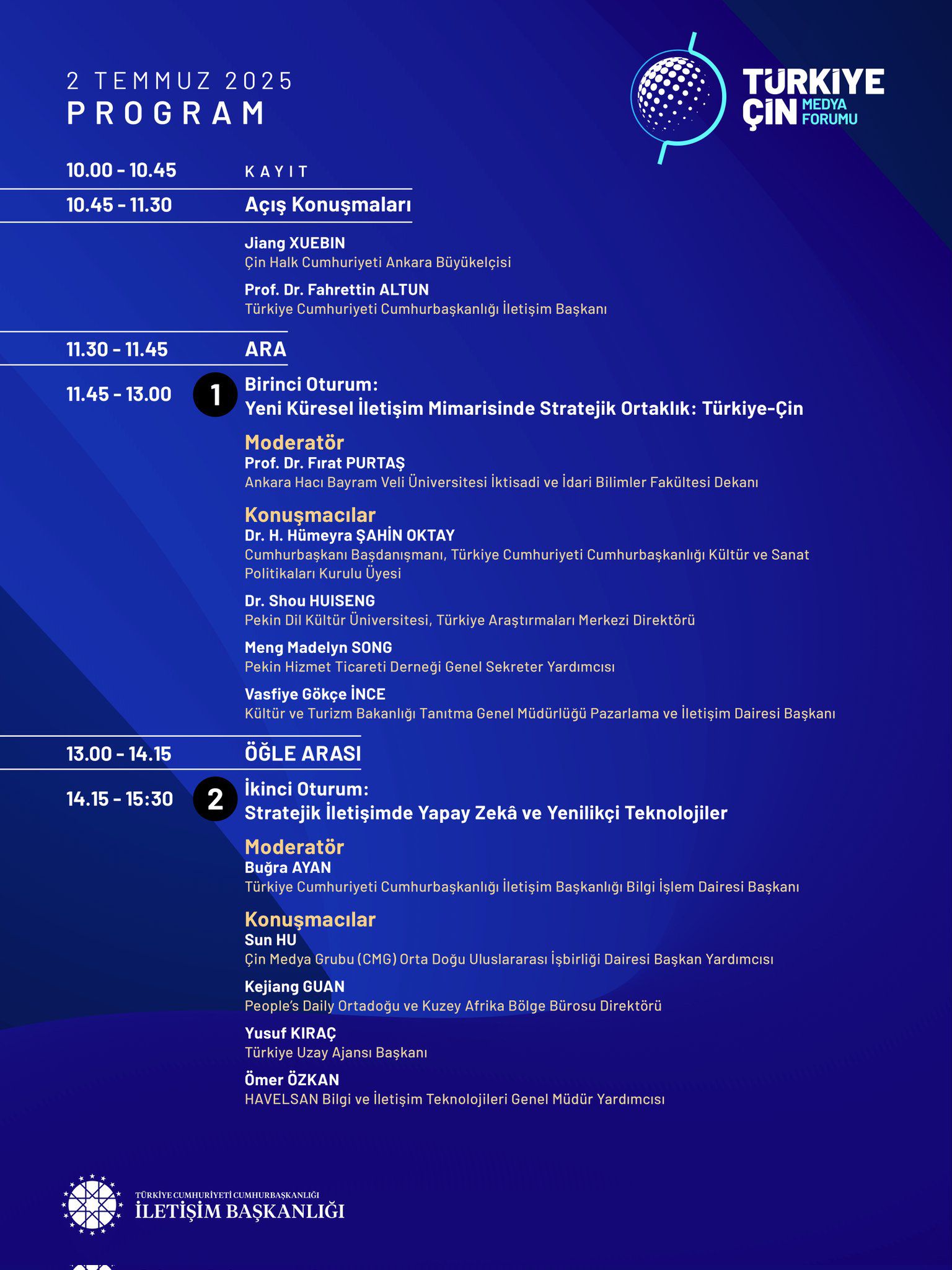 Forum kapsamında, iki ana oturumdan oluşan panel düzenlenecek. "Yeni Küresel İletişim Mimarisinde Stratejik Ortaklık: Türkiye–Çin" başlıklı ilk oturumda, iki ülke arasında iletişim alanındaki iş birliği fırsatları, küresel iletişim düzenindeki dönüşüm çerçevesinde değerlendirilecek.
