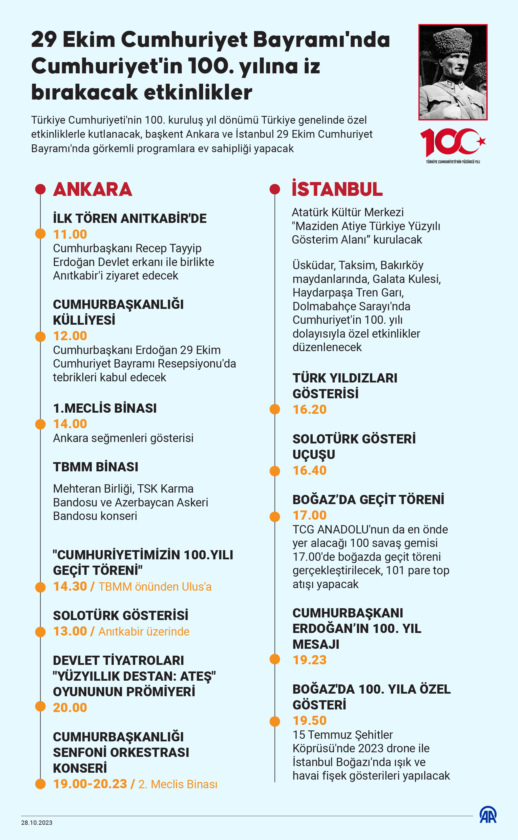 Bunun yanı sıra Üsküdar, Taksim, Bakırköy gibi meydanlarda ve Galata Kulesi, Haydarpaşa Tren Garı, Dolmabahçe Sarayı gibi tarihi mekanlarda Cumhuriyet'in 100. yılı dolayısıyla özel etkinlikler, dijital sergiler ve üç boyutlu gösteriler düzenlenecek.