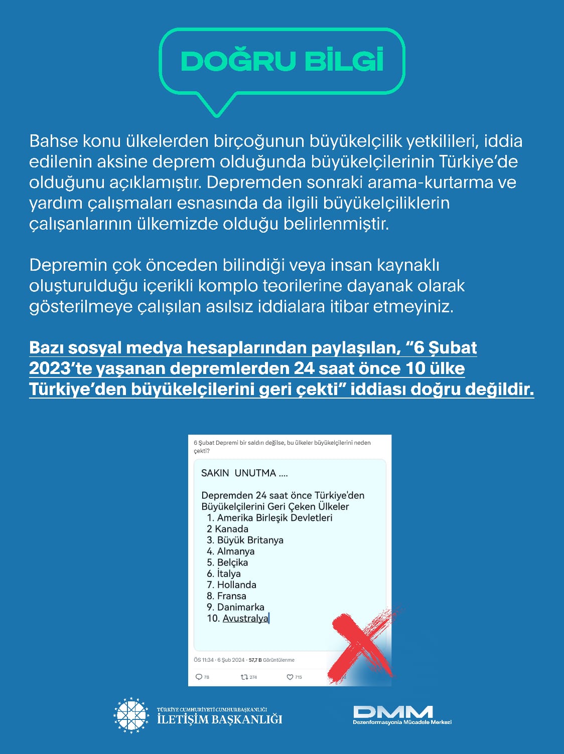 Bazı sosyal medya hesaplarından paylaşılan, “6 Şubat 2023’te yaşanan depremlerden 24 saat önce 10 ülke Türkiye’den büyükelçilerini geri çekti” iddiası doğru değildir.