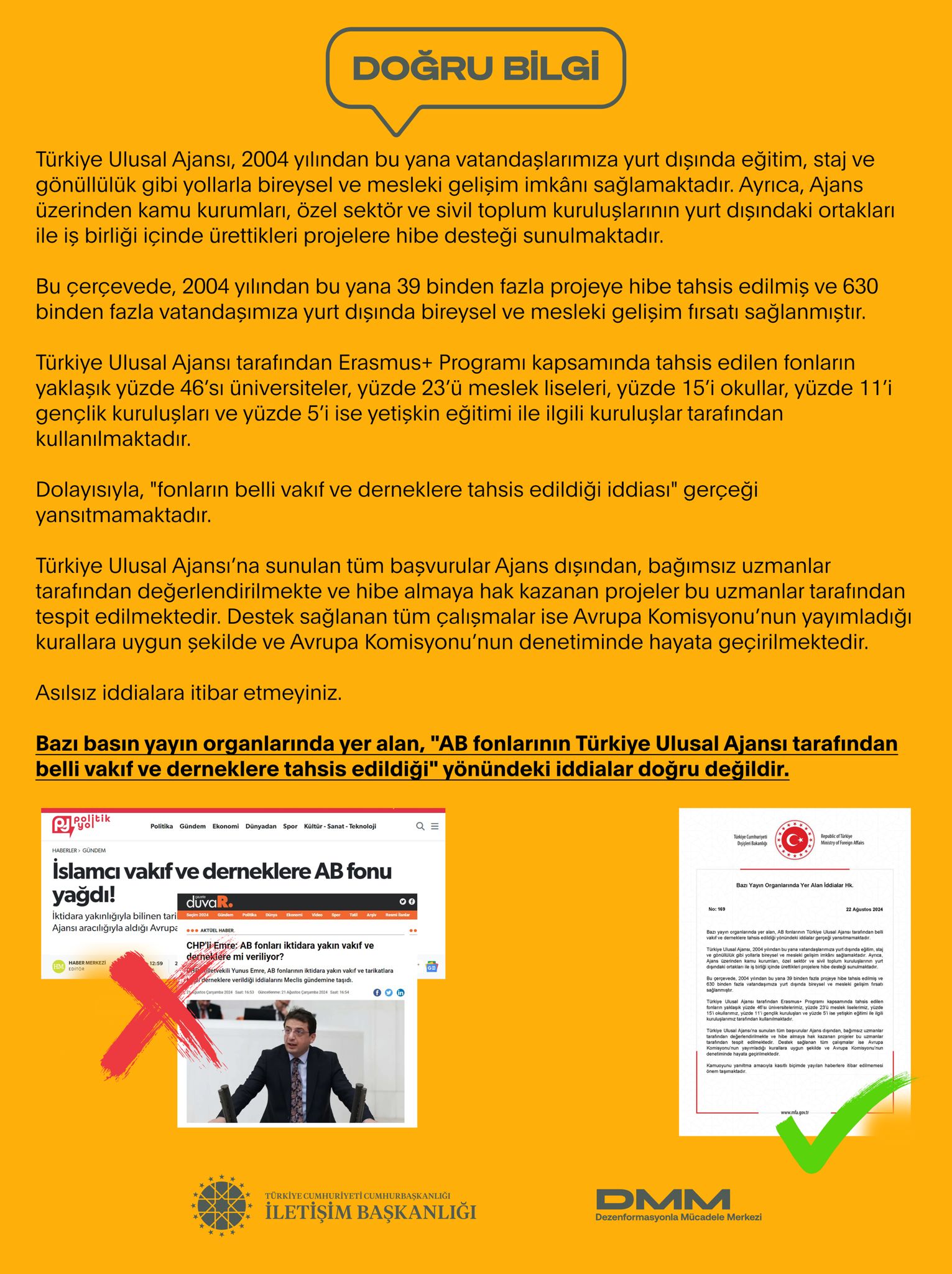 Bazı basın yayın organlarında yer alan, "AB fonlarının Türkiye Ulusal Ajansı tarafından belli vakıf ve derneklere tahsis edildiği" yönündeki iddialar doğru değildir.