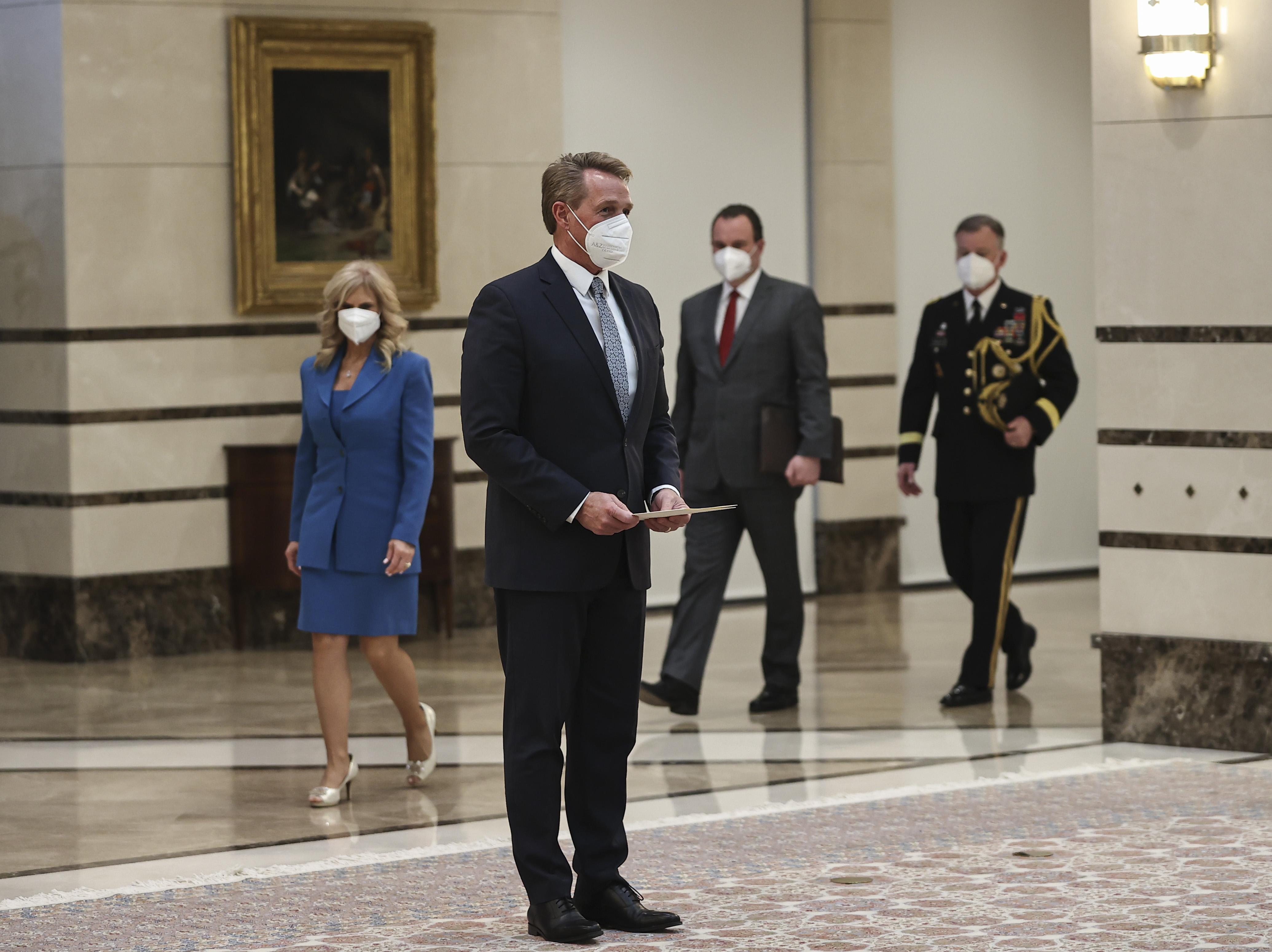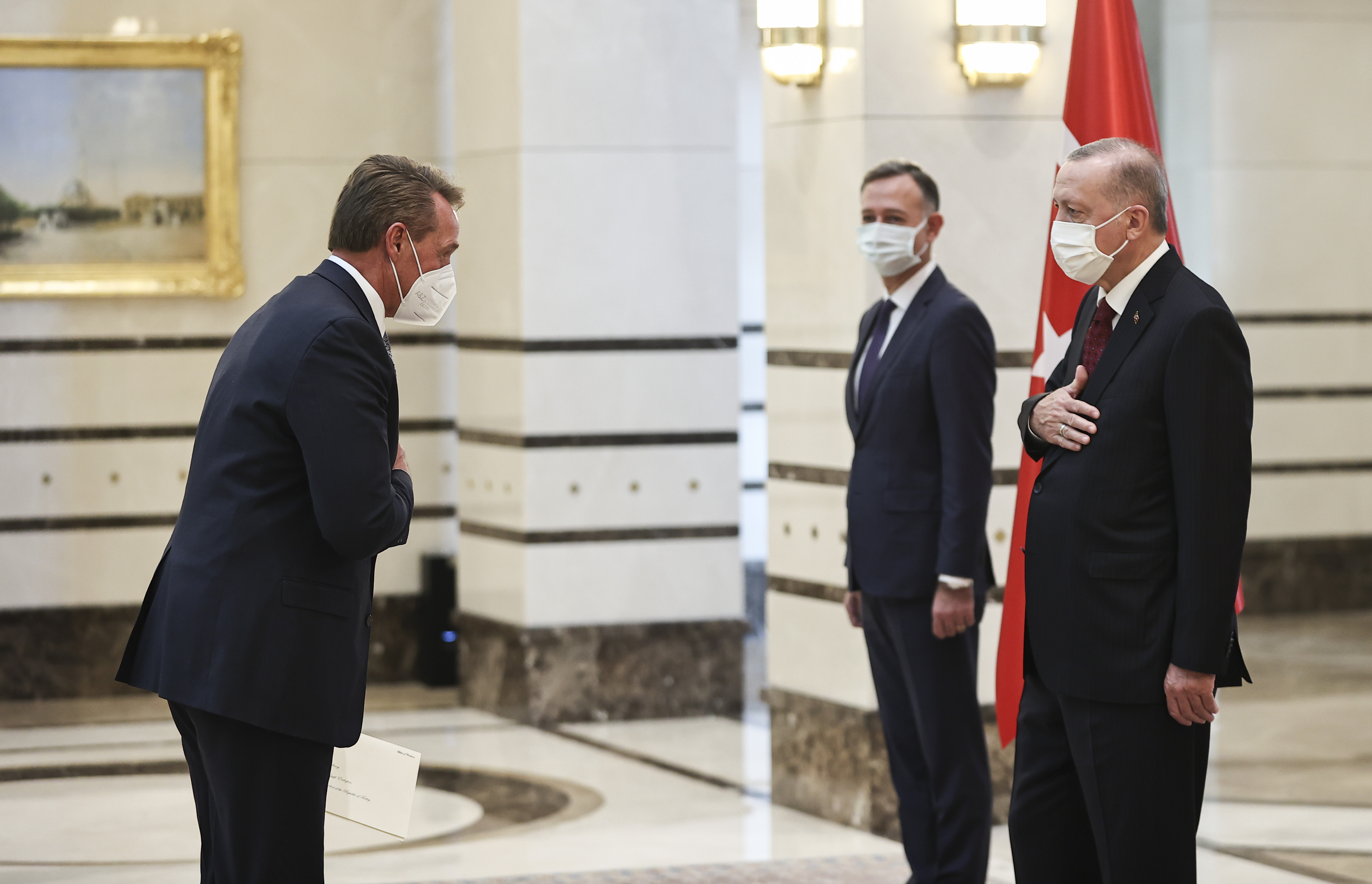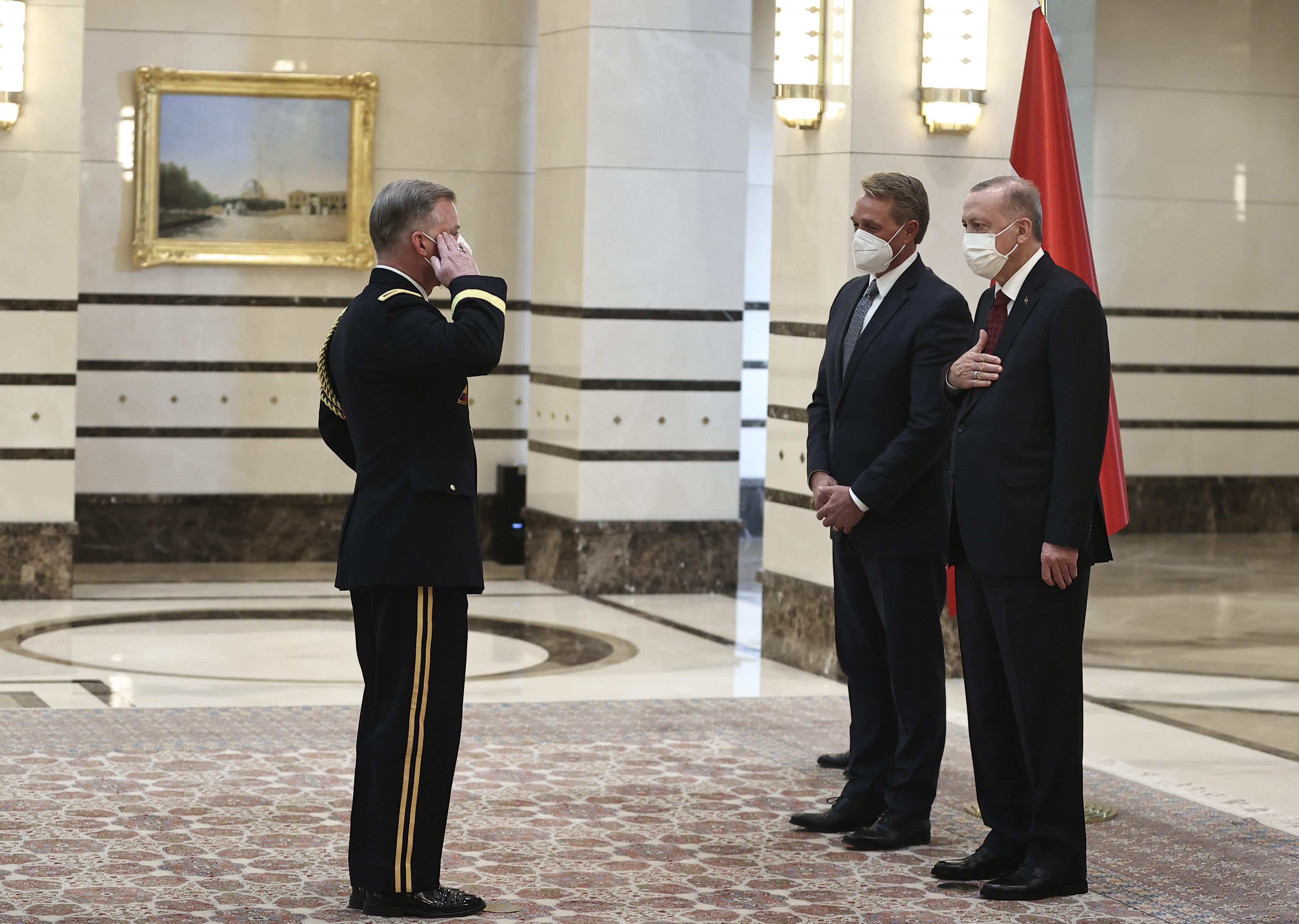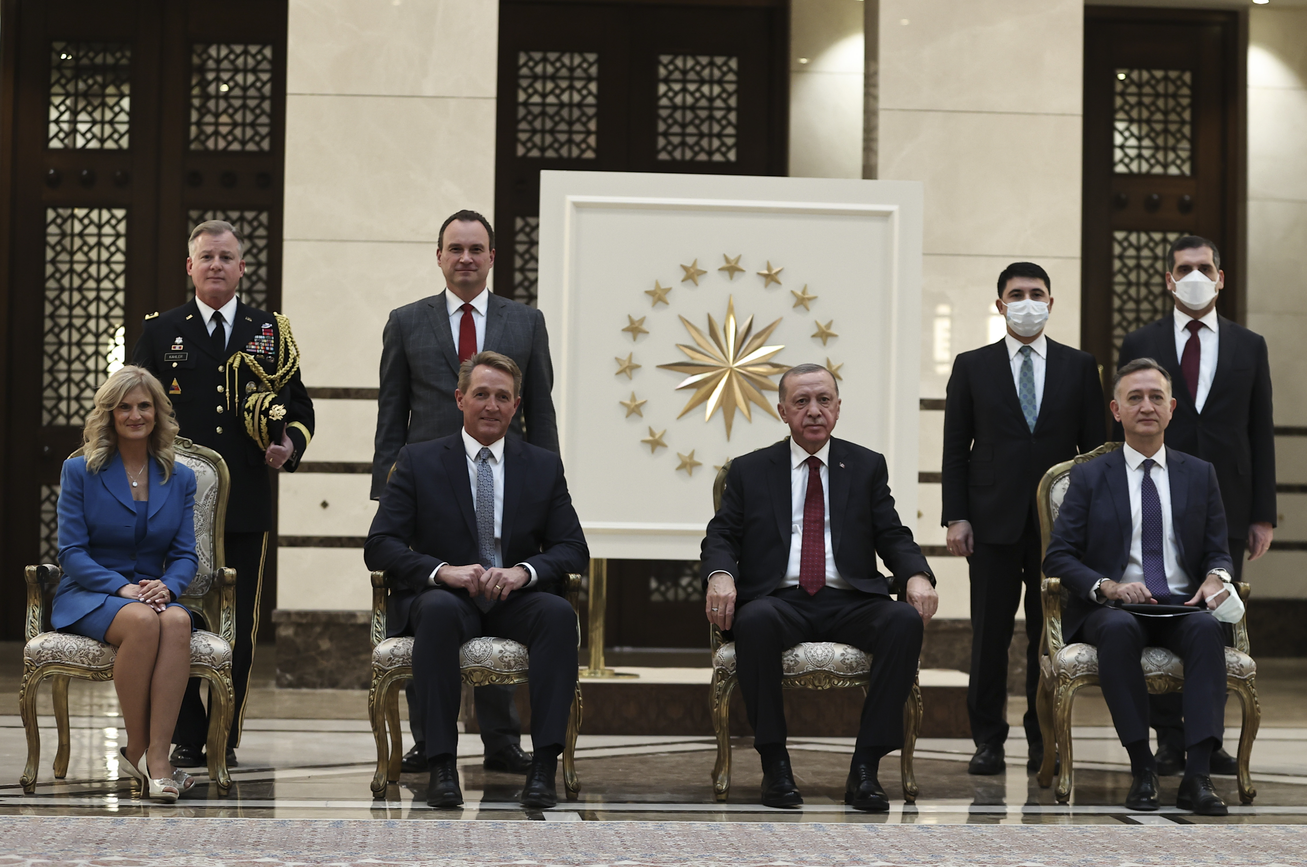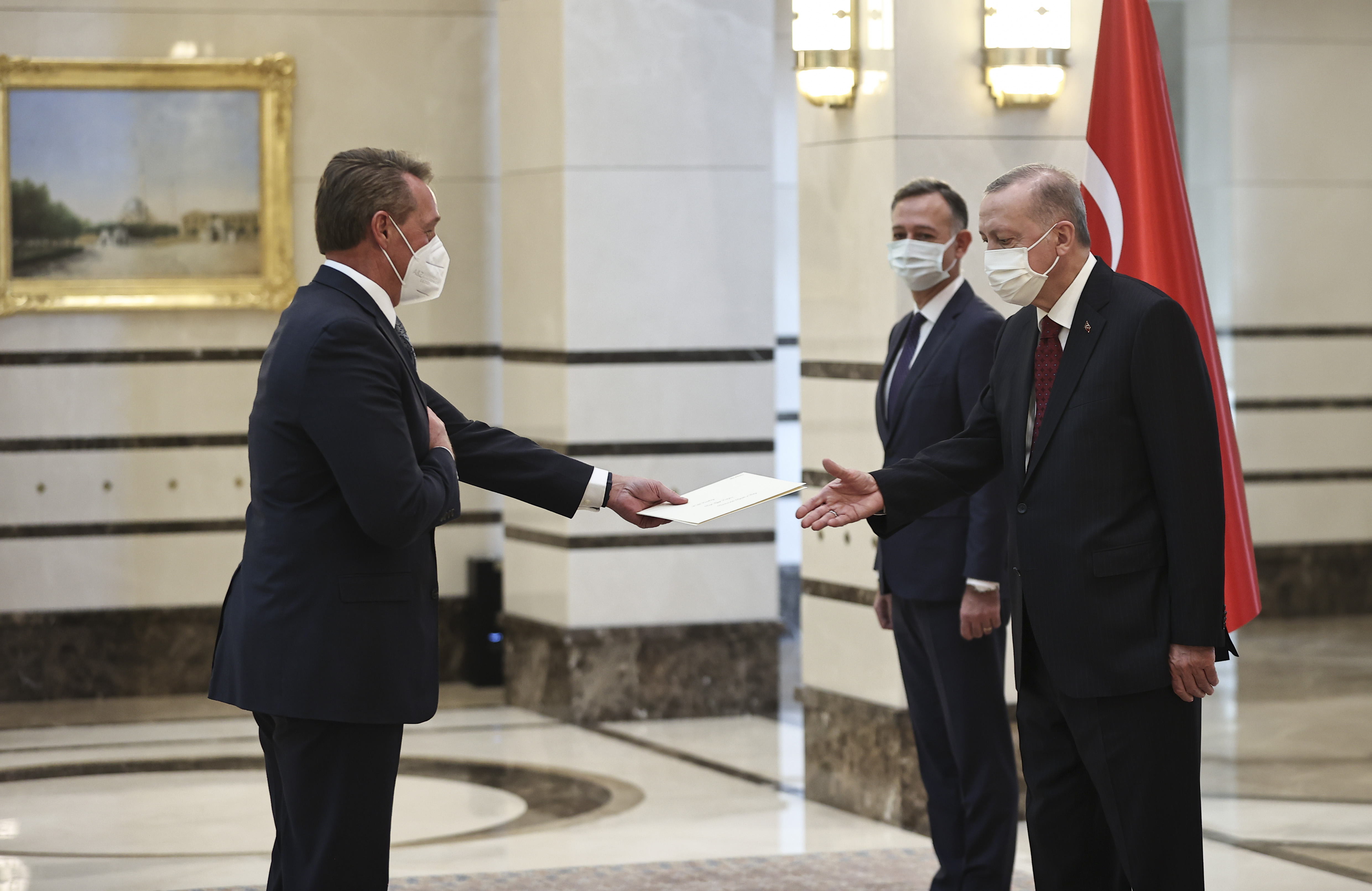 Cumhurbaşkanlığı Külliyesi'ndeki kabulde, ABD Büyükelçi Flake ve İtalya Büyükelçisi Marrapodi, Cumhurbaşkanı Erdoğan'a güven mektubu sundu.
