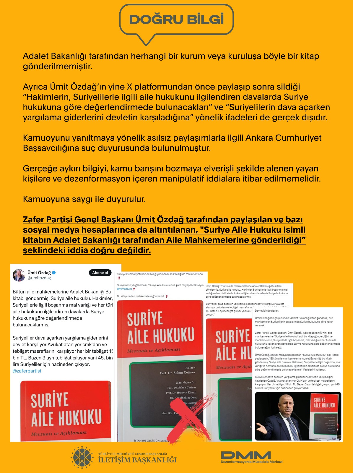 Zafer Partisi Genel Başkanı Ümit Özdağ tarafından paylaşılan ve bazı sosyal medya hesaplarınca da alıntılanan, "Suriye Aile Hukuku isimli kitabın Adalet Bakanlığı tarafından Aile Mahkemelerine gönderildiği” şeklindeki iddia doğru değildir.
