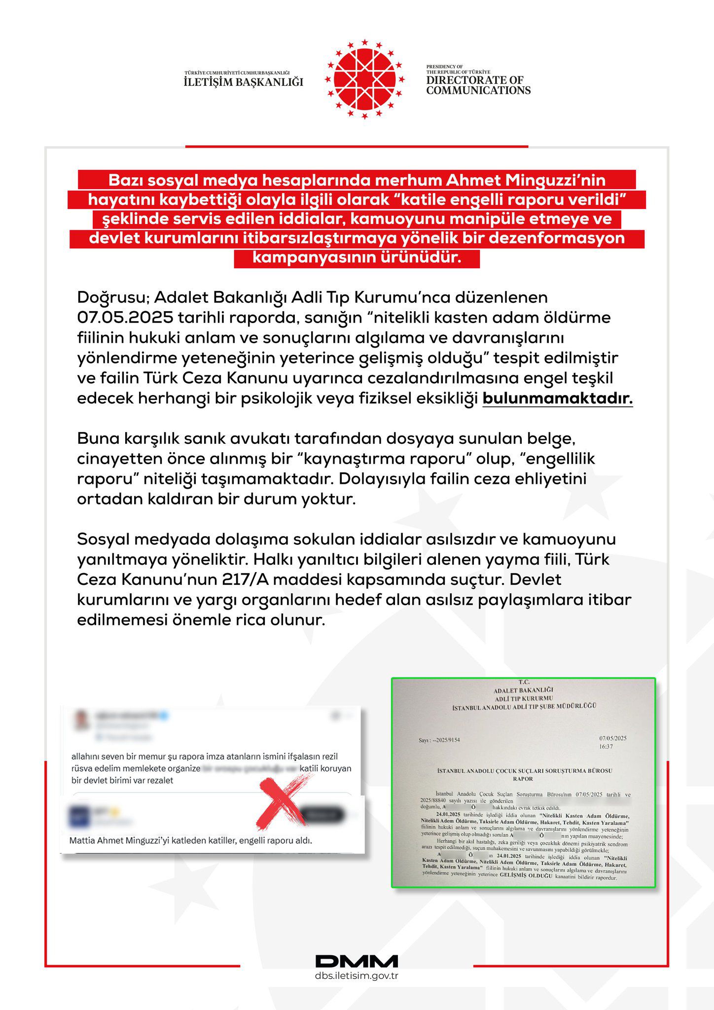 Bazı sosyal medya hesaplarında merhum Ahmet Minguzzi’nin hayatını kaybettiği olayla ilgili olarak “katile engelli raporu verildi” şeklinde servis edilen iddialar, kamuoyunu manipüle etmeye ve devlet kurumlarını itibarsızlaştırmaya yönelik bir dezenformasyon kampanyasının ürünüdür.