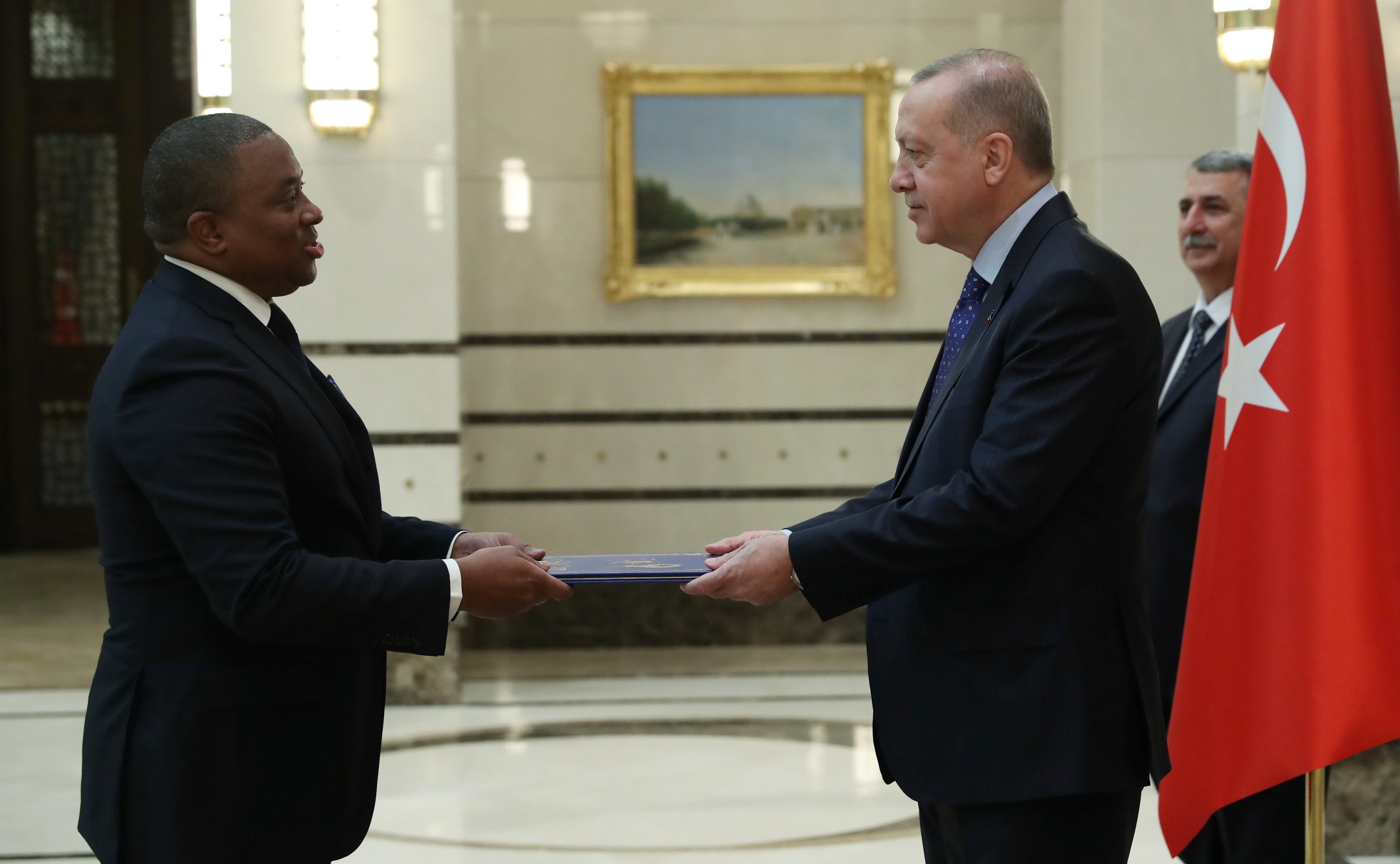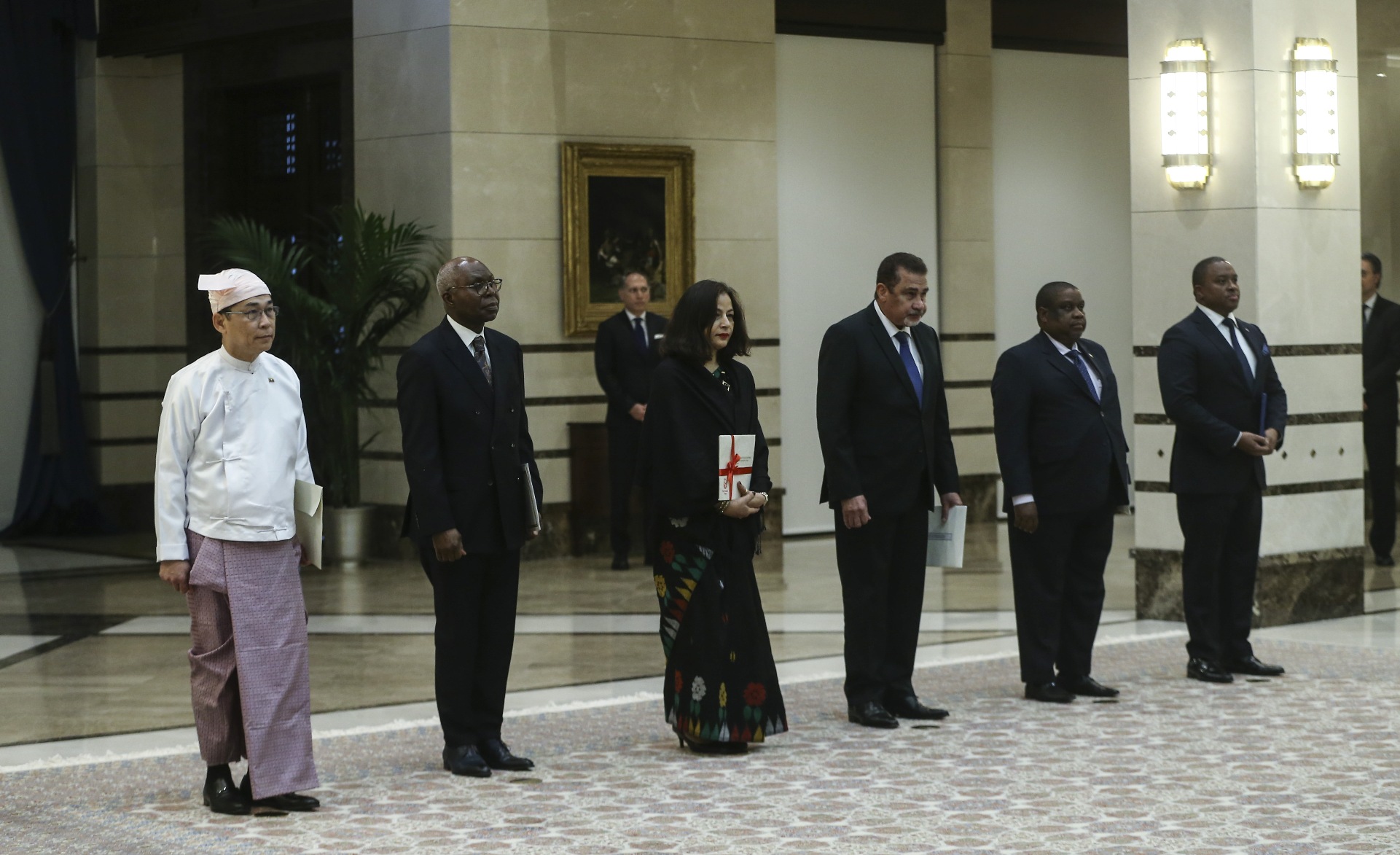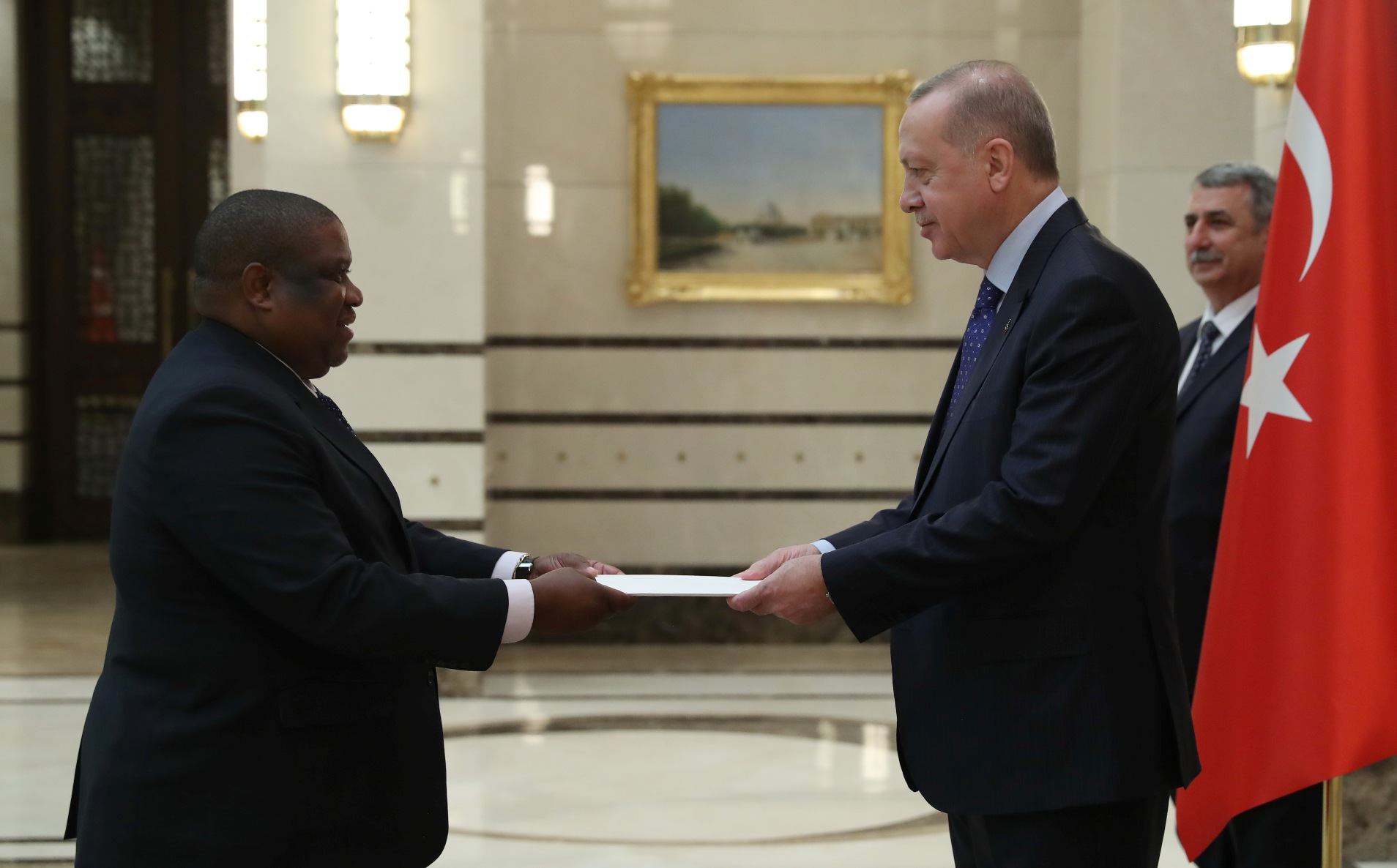 Cumhurbaşkanlığı Külliyesi'ndeki törende, Esvatini Büyükelçisi Sibusisiwe Mngomezulu, Mozambik Büyükelçisi Cesar Francisco De Gouveia Junior, Seyşeller Büyükelçisi Louis Sylvestre Radegonde, Nepal Büyükelçisi Sewa Lamsal Adhikari, Togo Büyükelçisi Komi Bayadze Dagoh ve Myanmar Büyükelçisi Myint Lwin aynı anda Cumhurbaşkanı Erdoğan'a güven mektubu sundu.