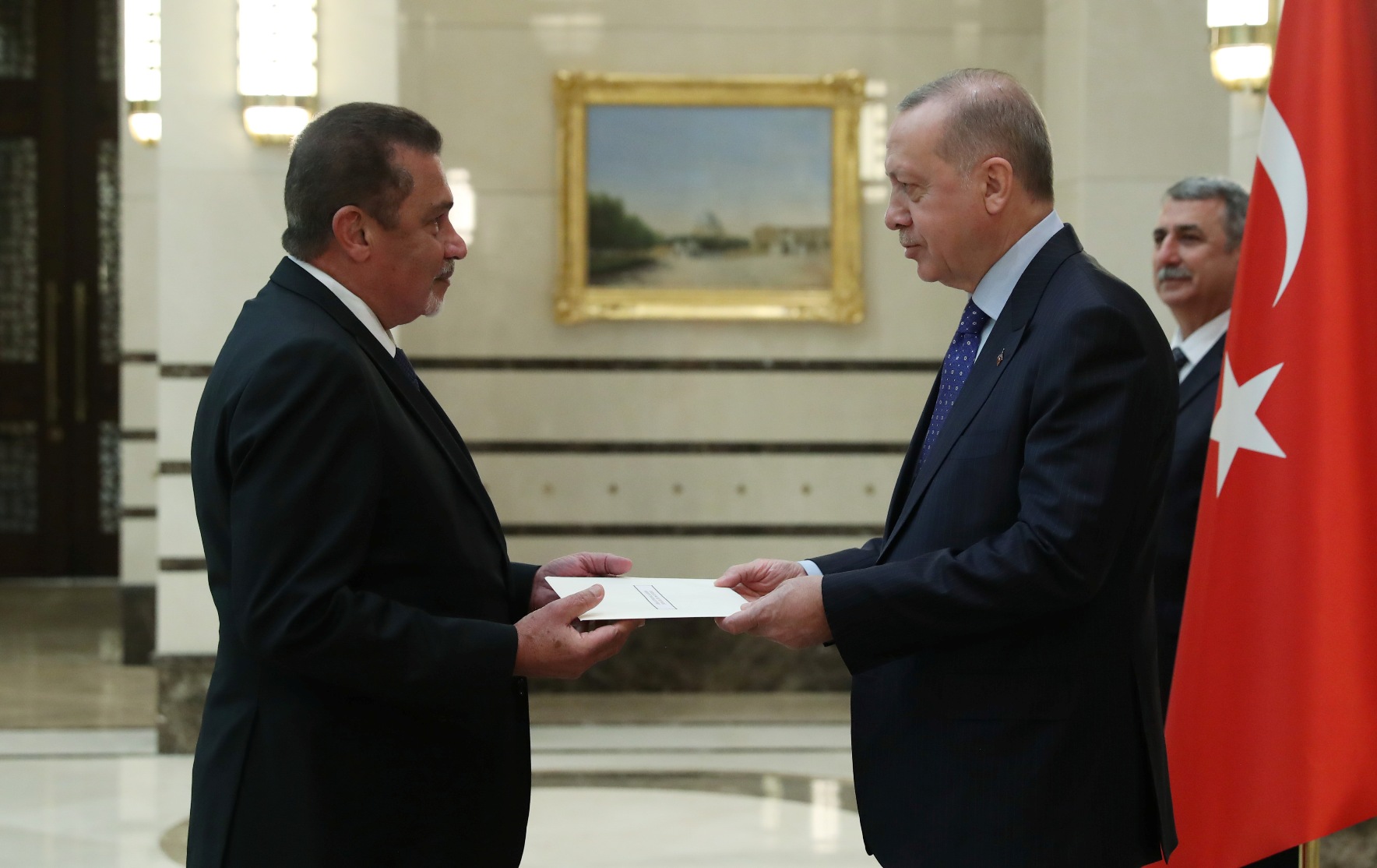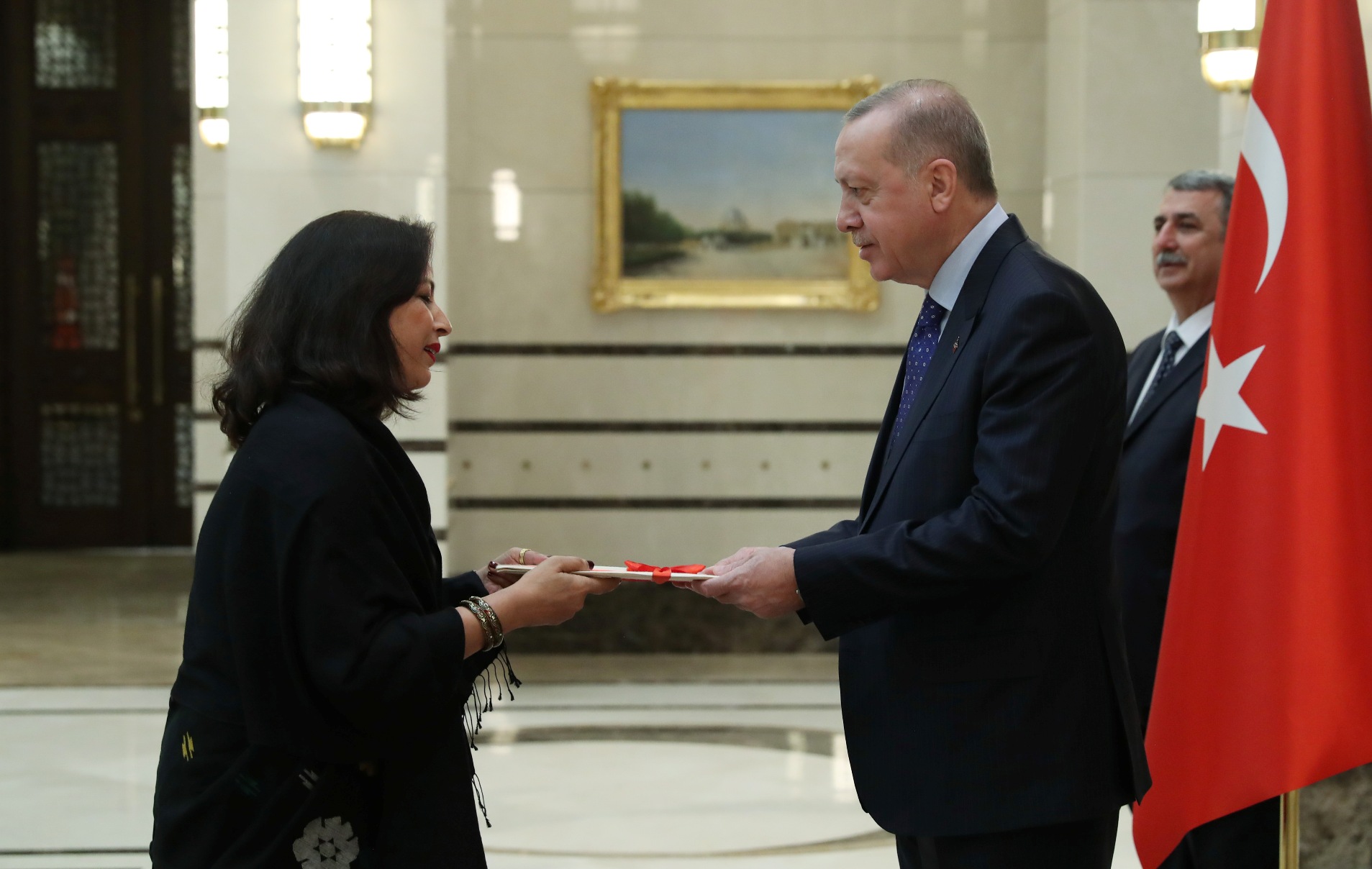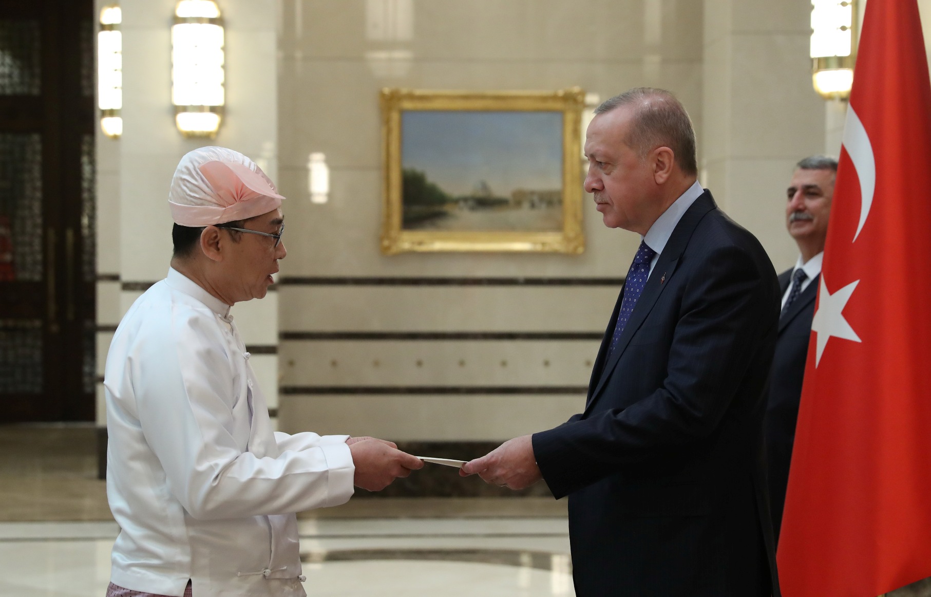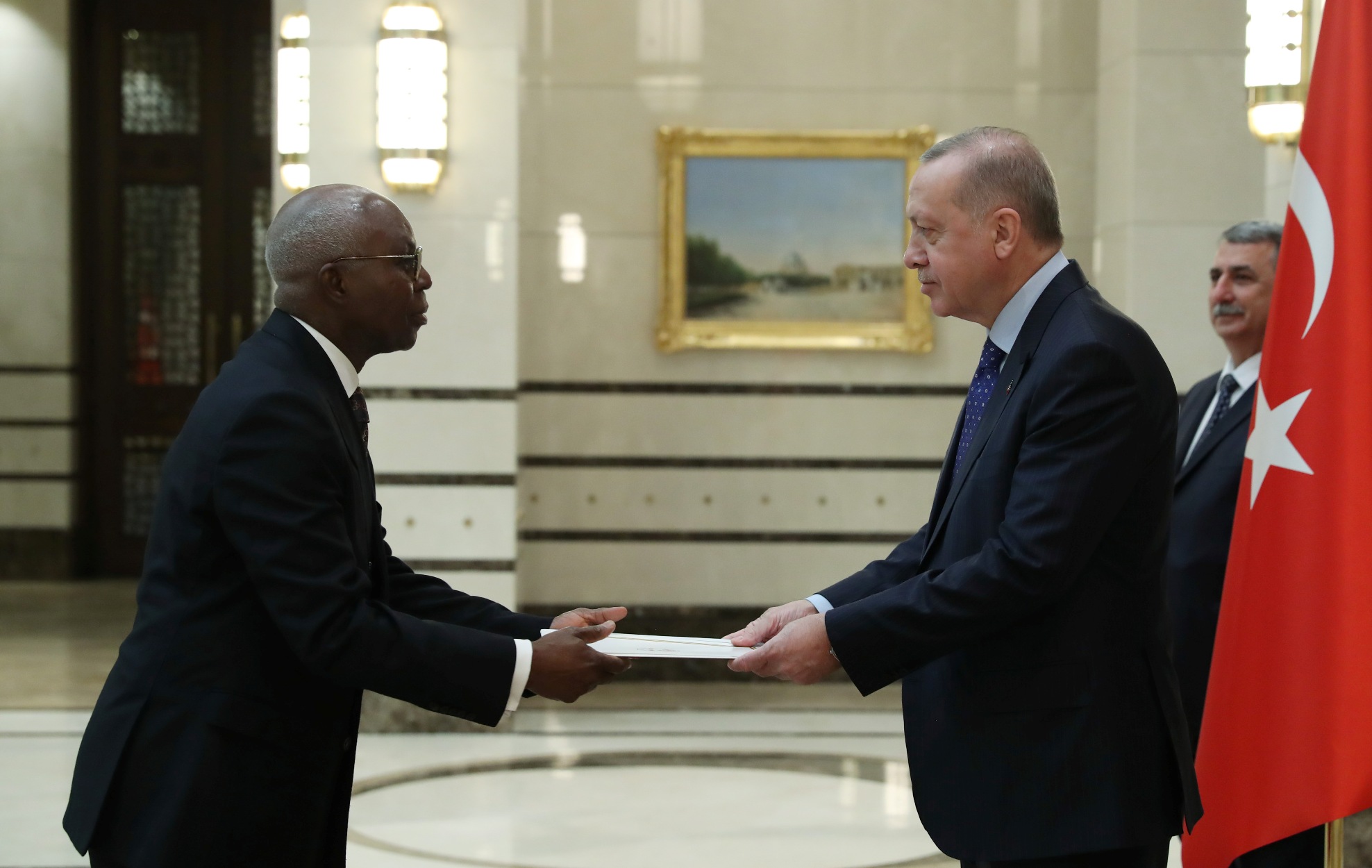 Cumhurbaşkanlığı Külliyesi'ndeki törende, Esvatini Büyükelçisi Sibusisiwe Mngomezulu, Mozambik Büyükelçisi Cesar Francisco De Gouveia Junior, Seyşeller Büyükelçisi Louis Sylvestre Radegonde, Nepal Büyükelçisi Sewa Lamsal Adhikari, Togo Büyükelçisi Komi Bayadze Dagoh ve Myanmar Büyükelçisi Myint Lwin aynı anda Cumhurbaşkanı Erdoğan'a güven mektubu sundu.