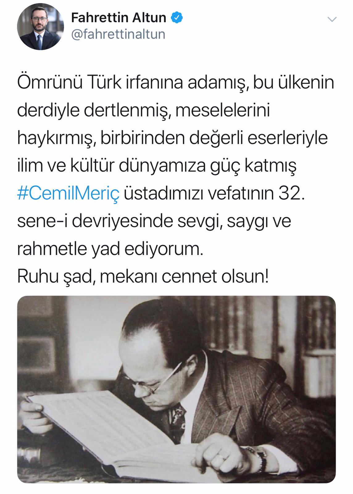Altun, Twitter hesabından, "Ömrünü Türk irfanına adamış, bu ülkenin derdiyle dertlenmiş, meselelerini haykırmış, birbirinden değerli eserleriyle ilim ve kültür dünyamıza güç katmış Cemil Meriç üstadımızı vefatının 32. sene-i devriyesinde sevgi, saygı ve rahmetle yad ediyorum. Ruhu şad, mekanı cennet olsun." mesajını paylaştı.