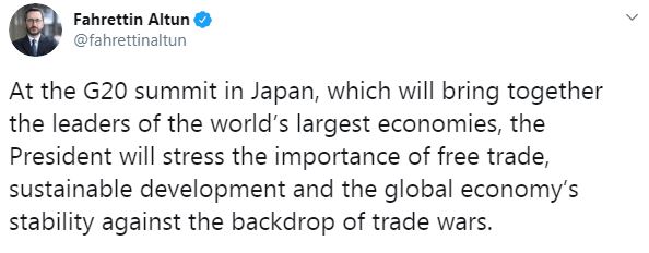 Japonya'da ekonomileri en büyük ülke liderlerini buluşturacak G20 Zirvesinde Cumhurbaşkanı Erdoğan'ın, ticaret savaşlarının yoğunlaştığı bir dönemde serbest ticaretin, sürdürülebilir büyümenin ve küresel ekonomik istikrarın önemini anlatacağını bildiren Fahrettin Altun, şunları kaydetti: